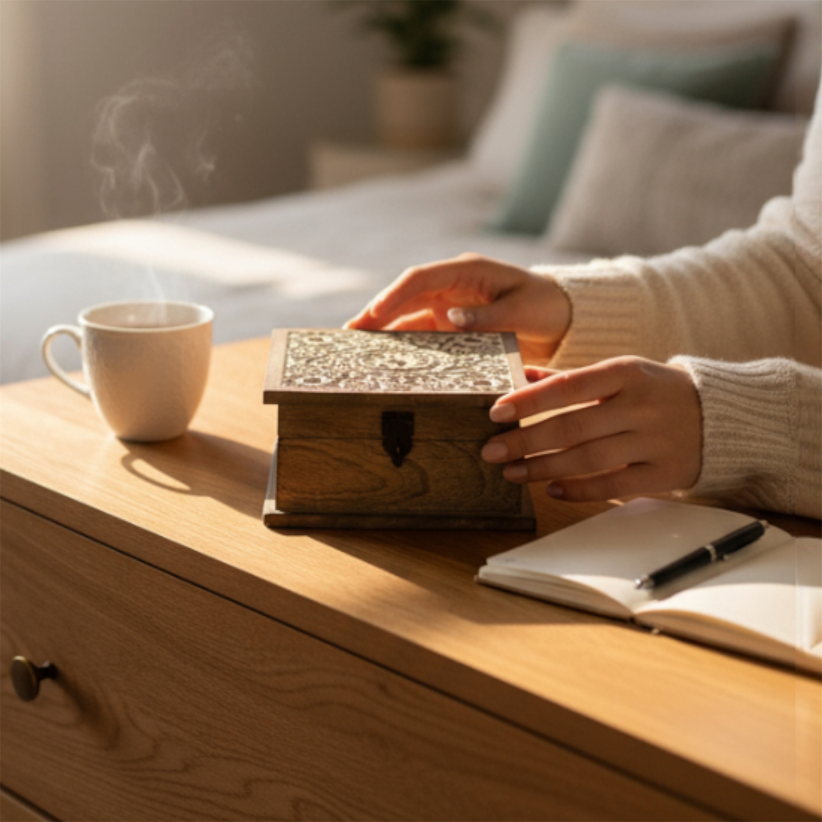 Crafted by skilled artisans this square table box is made of high-quality wood and features exquisite hand-carved details of flowers and gardens. The hinged lid allows easy access to the contents of the box making it a great storage option for small items such as jewelry trinkets or keepsakes.