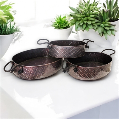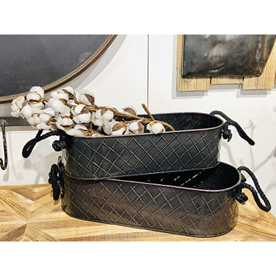 Set of 3 Embossed metal over-sized french flower bucets with rope side handles. Glossy bronze finish perfect for display of dried and silk permanent florals (not watertight).