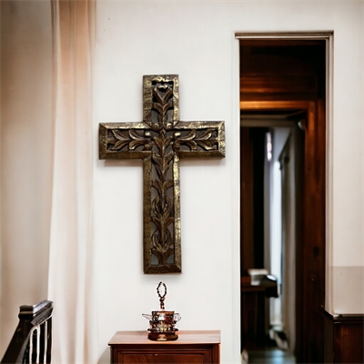 Introducing the Rosemary Hand-Carved Mango Wood Wall Cross from India, a sublime blend of artistic elegance and spiritual grace. This cross features an intricate floral design meticulously carved in the center, adorned with delicate laurel leaves and piercings throughout, creating a symbol of enduring beauty and connection. Finished in a rich Pecan Stain, the cross measures 11.75 wide, 0.75 thick, and stands at an impressive 17.75 high.