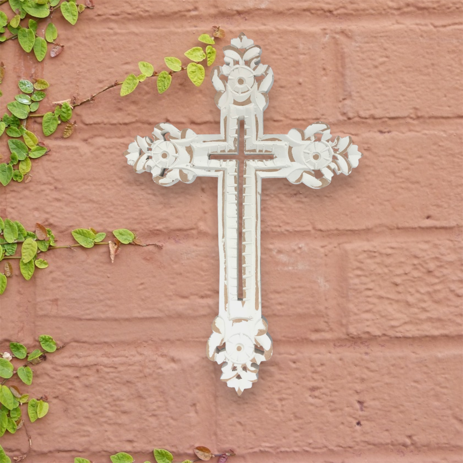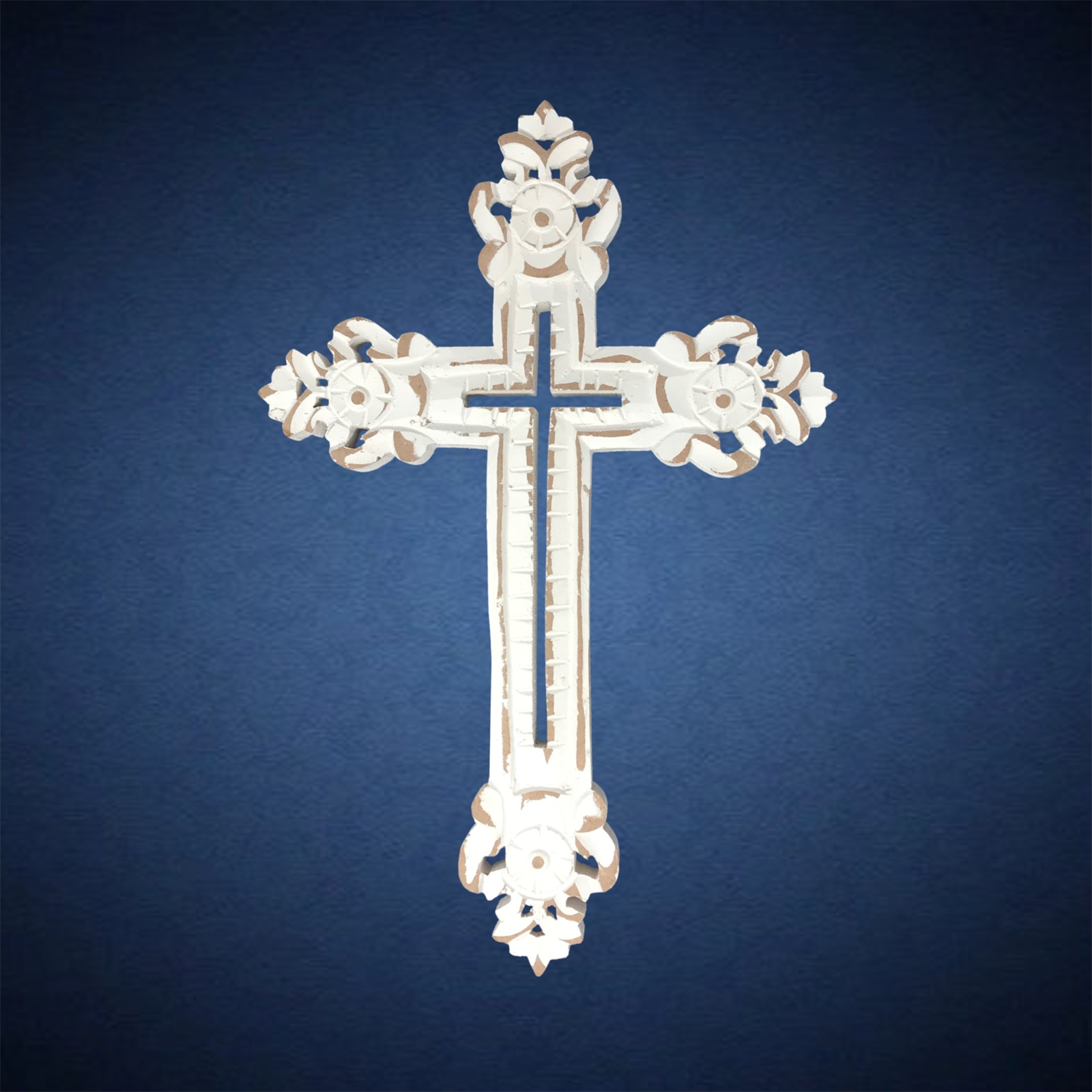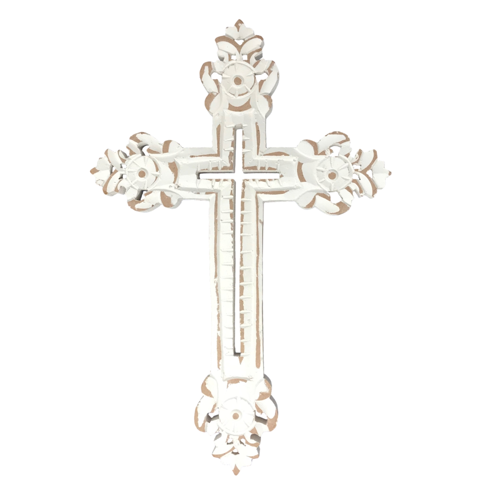 Royal Orleans Hand-Carved Wood Wall Cross from India. This exquisite piece showcases stunning scroll work along the edges complemented by a beautifully pierced cross in the center. The hand patina in Shabby Chic White Finish adds a touch of elegance and vintage charm. Measuring 8 x .5 x 12 high this handcrafted cross is perfect for adding a spiritual accent to any space. The sawtooth hanger on the back ensures easy and secure mounting. Elevate your decor with the timeless beauty and craftsmanship of the Royal Orleans Hand-Carved Wood Wall Cross.