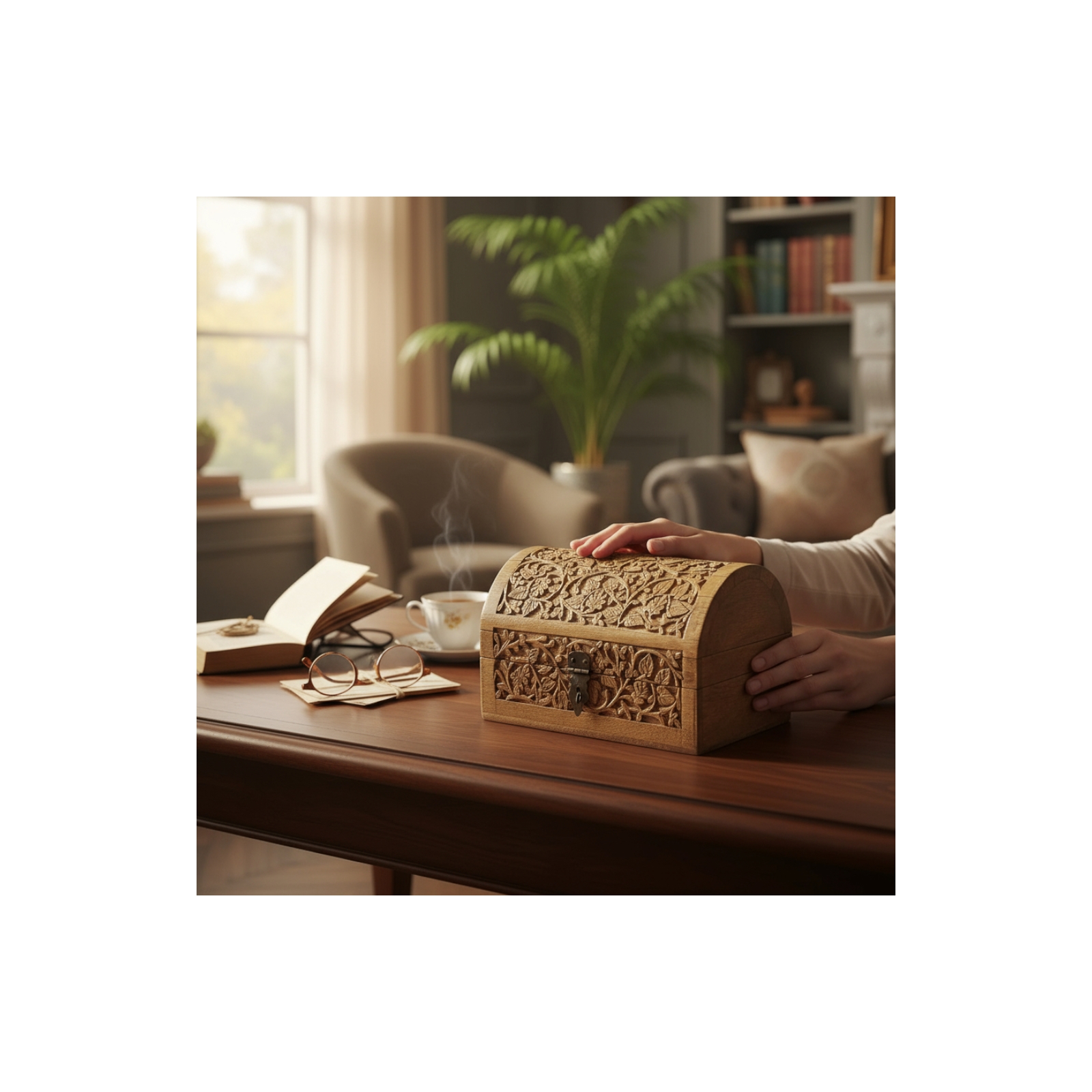 Introducing our exquisite Handmade Domed Table Chest, meticulously hand-carved from lustrous mango wood in the heart of India. This 9x6x6-inch marvel is a fusion of artistry and functionality, serving as the perfect home for your remote controls or cherished jewelry.