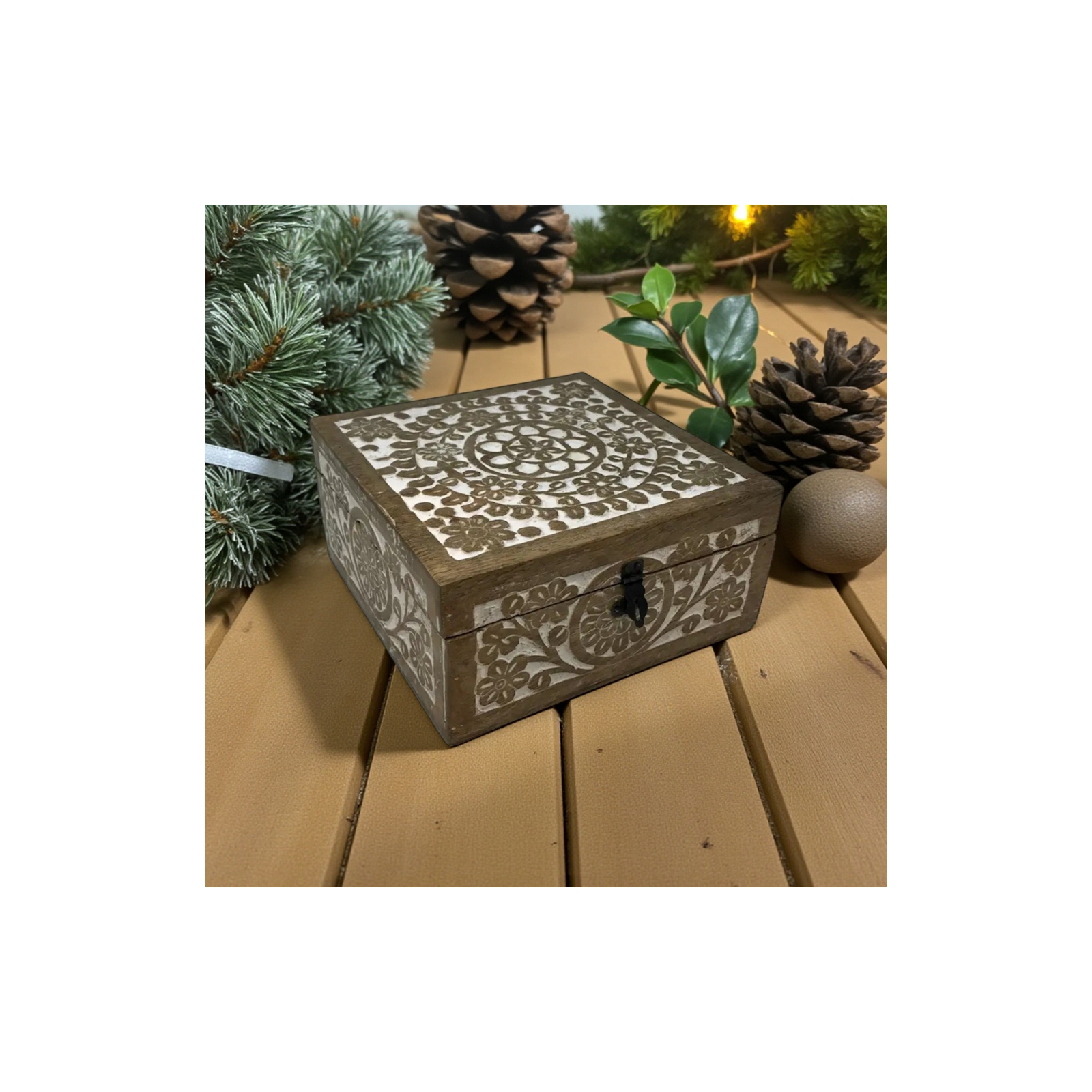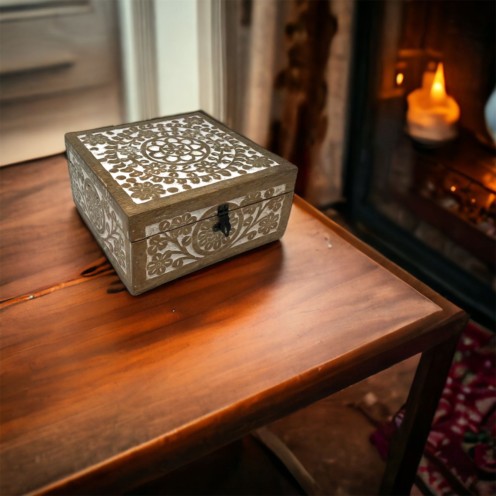 Aztec Medium Hinged Hand Carved Box an exquisite addition to any home or retail space. This box is crafted by skilled artisans in India and features a beautiful white wash finish giving it a timeless and elegant appearance.