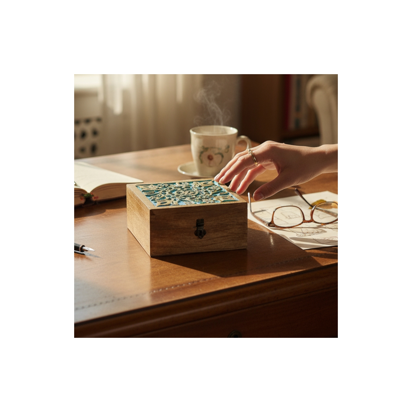 Introducing the Hand-Carved Wood Midnight Garden Hinged Square Table Box a stunning and unique addition to any retail space. Handcrafted in India this box is made with care and attention to detail ensuring that each piece is one-of-a-kind.