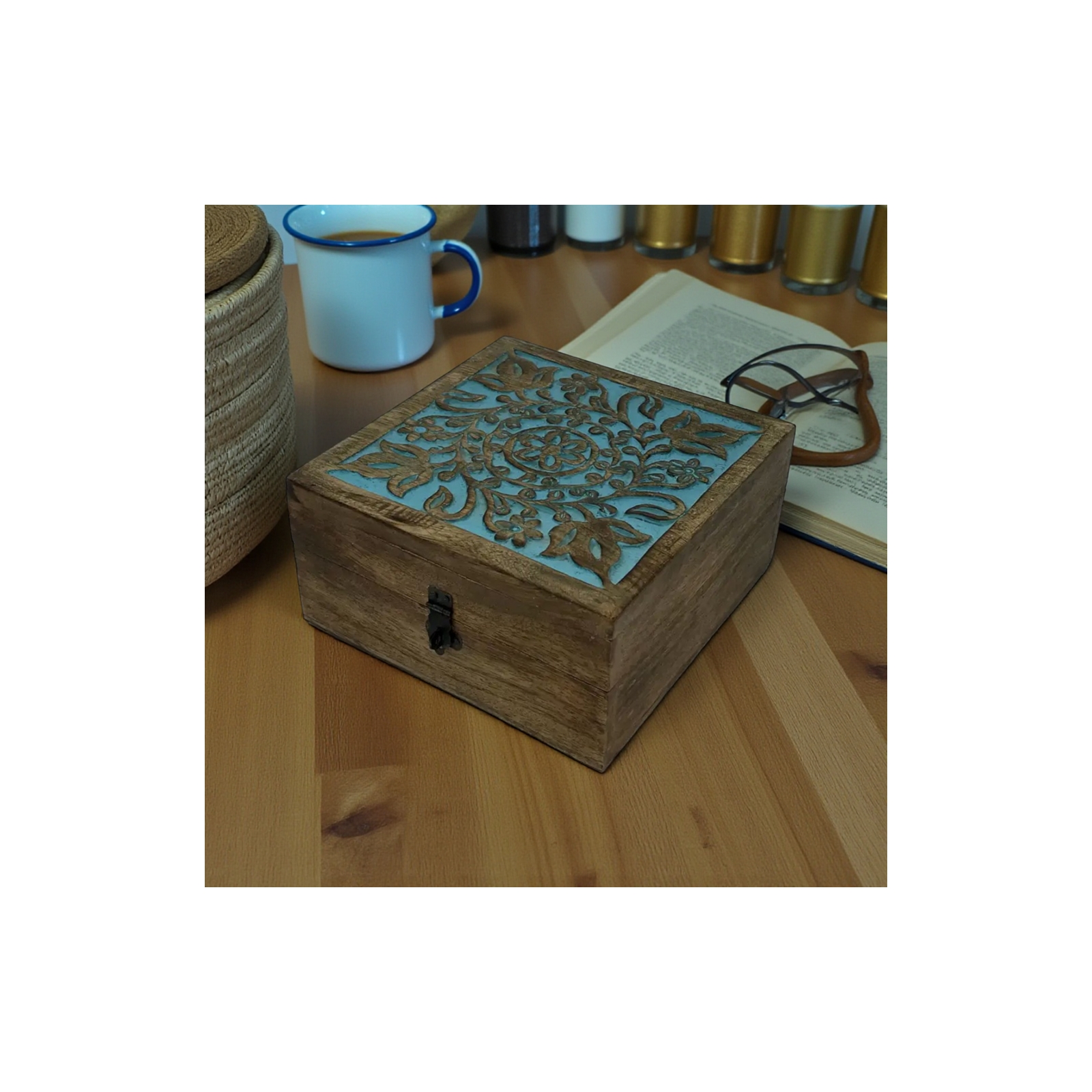 Featuring a beautiful midnight garden design this hinged box is a true work of art. The intricate carving on the wood is sure to catch the eye of anyone who walks by and the hand patina turquoise wash adds a touch of rustic charm.
