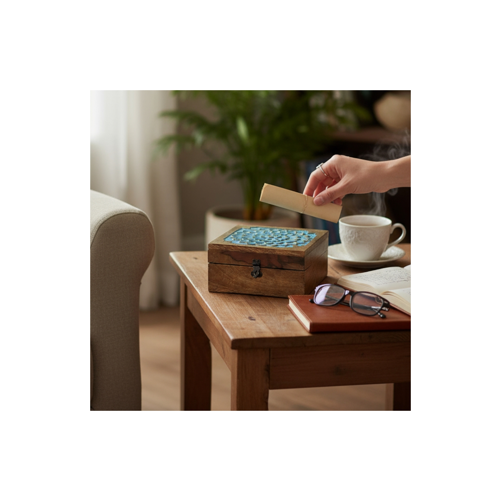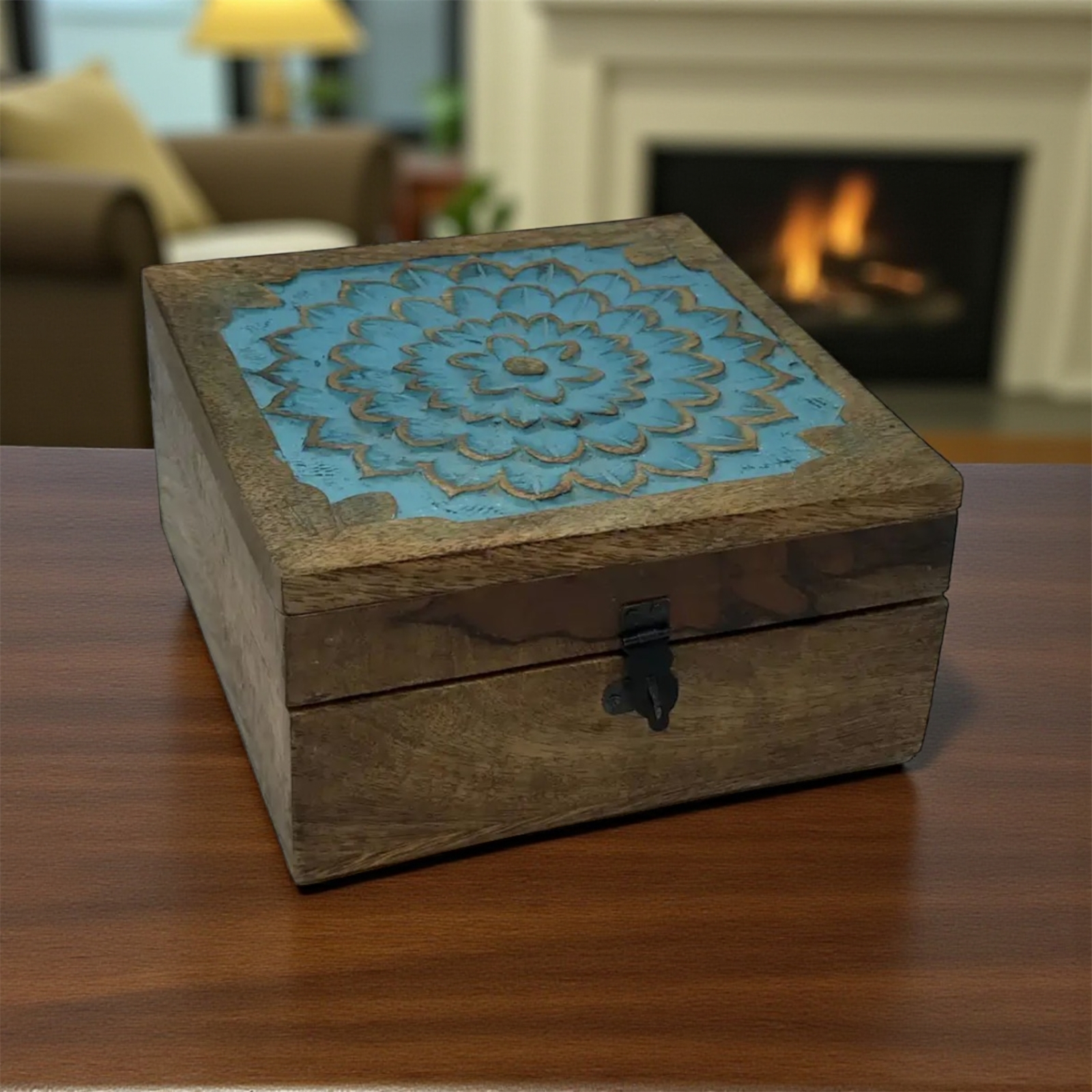 This Hand-Carved Wood water ripples turquoise Hinged Square Table Box is a unique and stylish addition to any home decor. The box is made in India by skilled artisans who have carved intricate water ripple designs into the wood giving it a beautiful and eye-catching texture. The turquoise color adds a pop of color and is sure to stand out in any room.