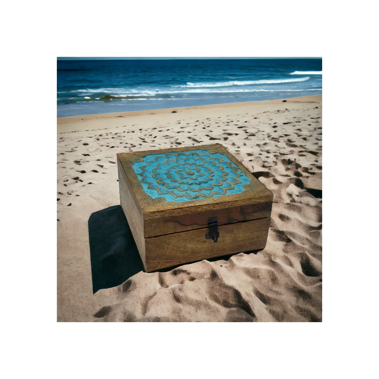 At a cost of only $25.00 retail this Hand-Carved Wood water ripples turquoise Hinged Square Table Box is an affordable way to add a touch of style and sophistication to any room.