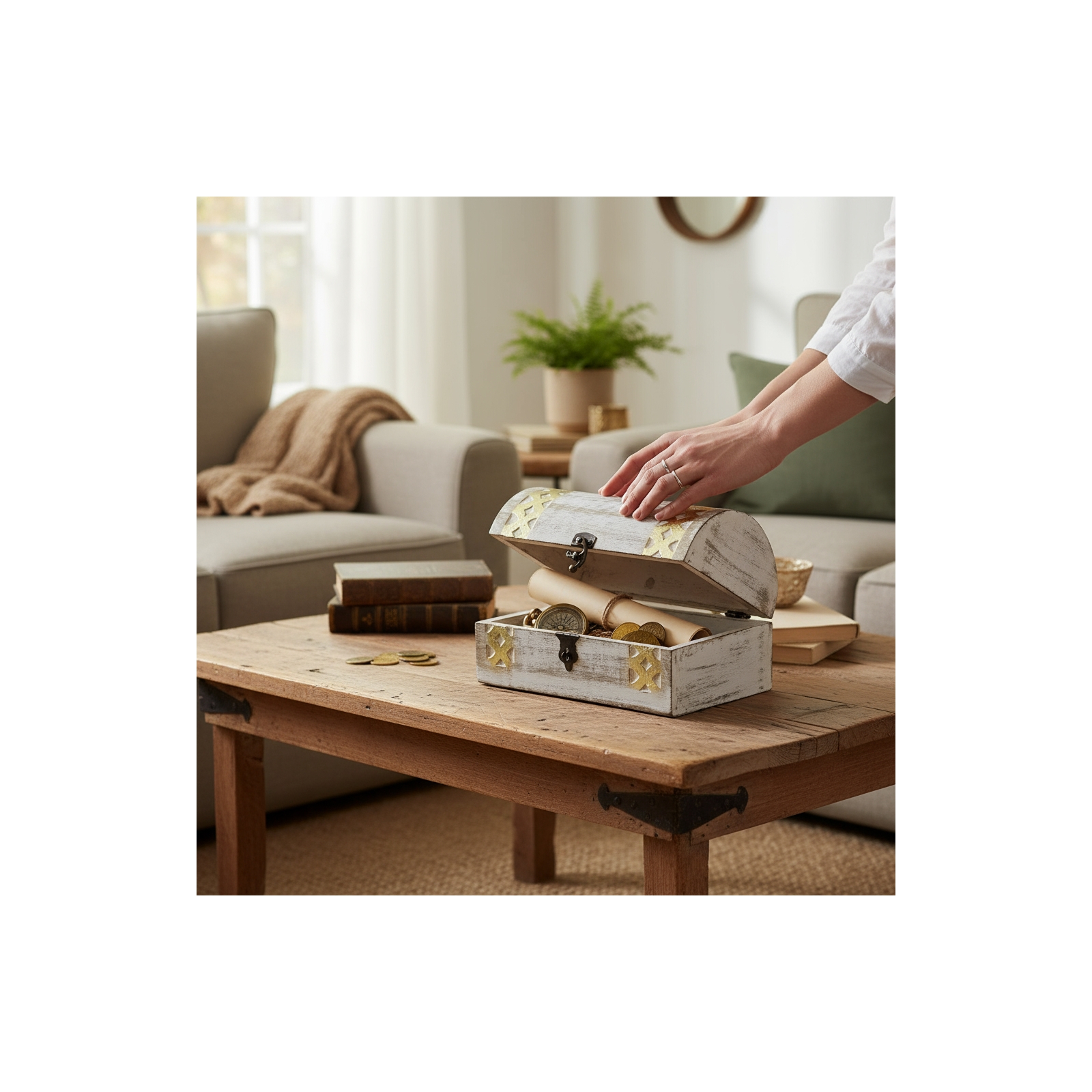 The chest is made from high-quality mango wood a durable and sustainable material that ensures longevity and beauty. The whitewashed finish provides a rustic and charming appearance while the gold foil detailing adds a touch of opulence and glamour.