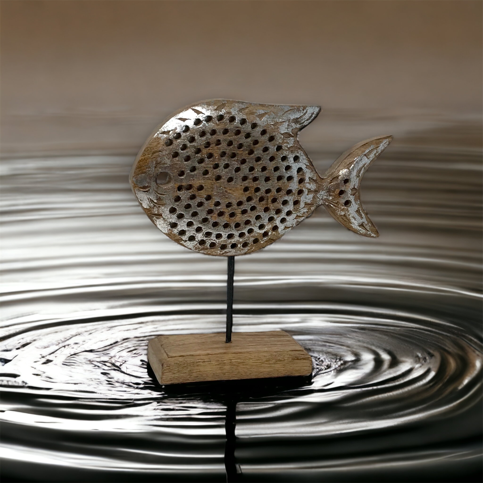 Pauly the Purana from our collection Fish Tales - hand-carved mango wood fish sculpture mounted on a post and pedestal base made by skilled Indian artisans and hand-finished in a honey stain with silver foil patina. Each figure is named adding a unique touch to this stunning collection.