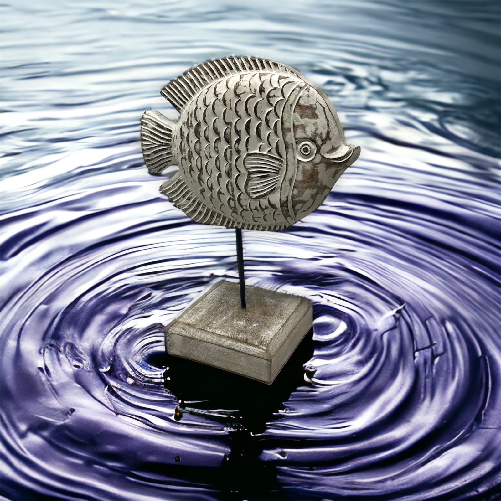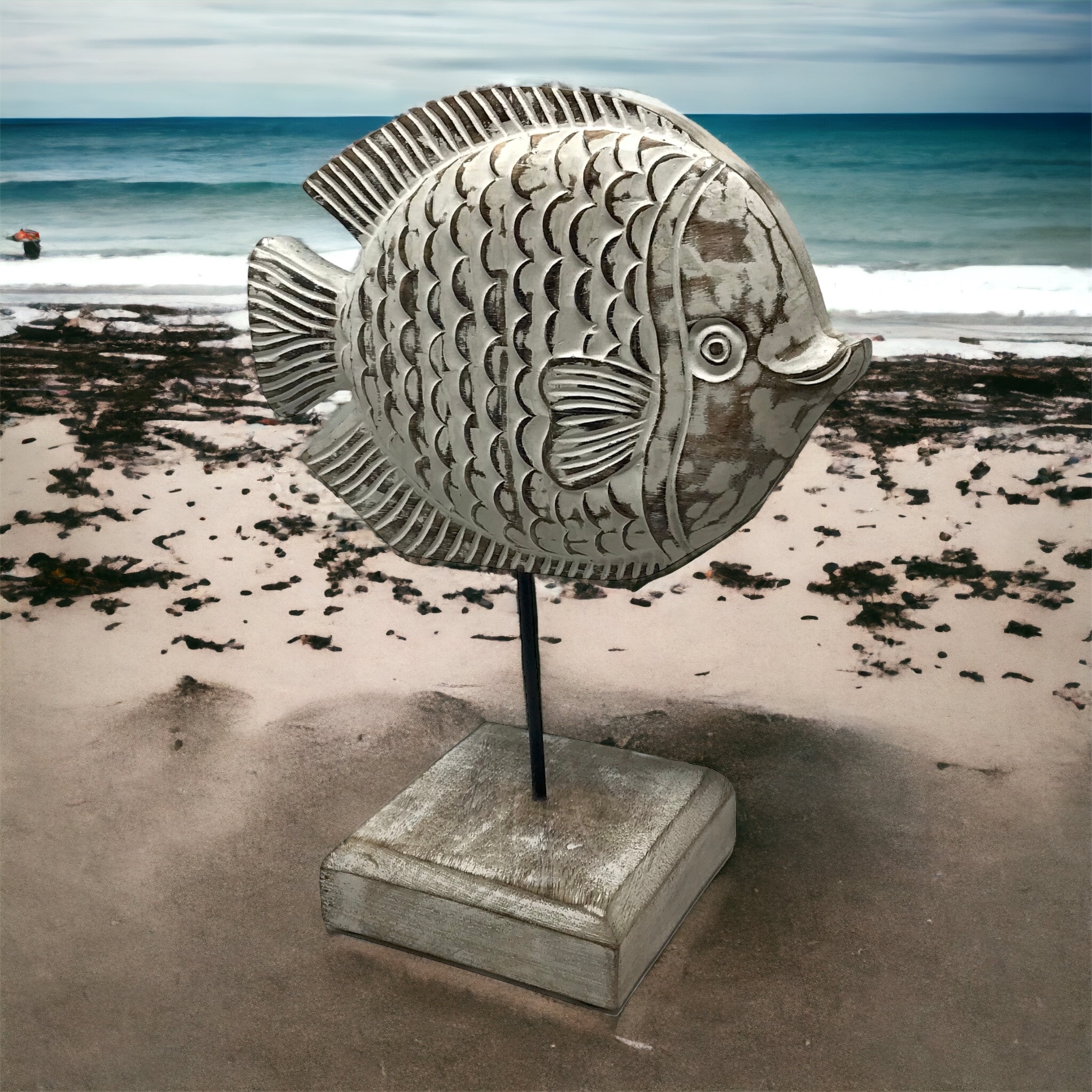 Angela Angelfish from our collection Fish Tales - hand-carved mango wood fish sculpture mounted on a post and pedestal base made by skilled Indian artisans and hand-finished in a white distressed patina. Each figure is named adding a unique touch to this stunning collection.