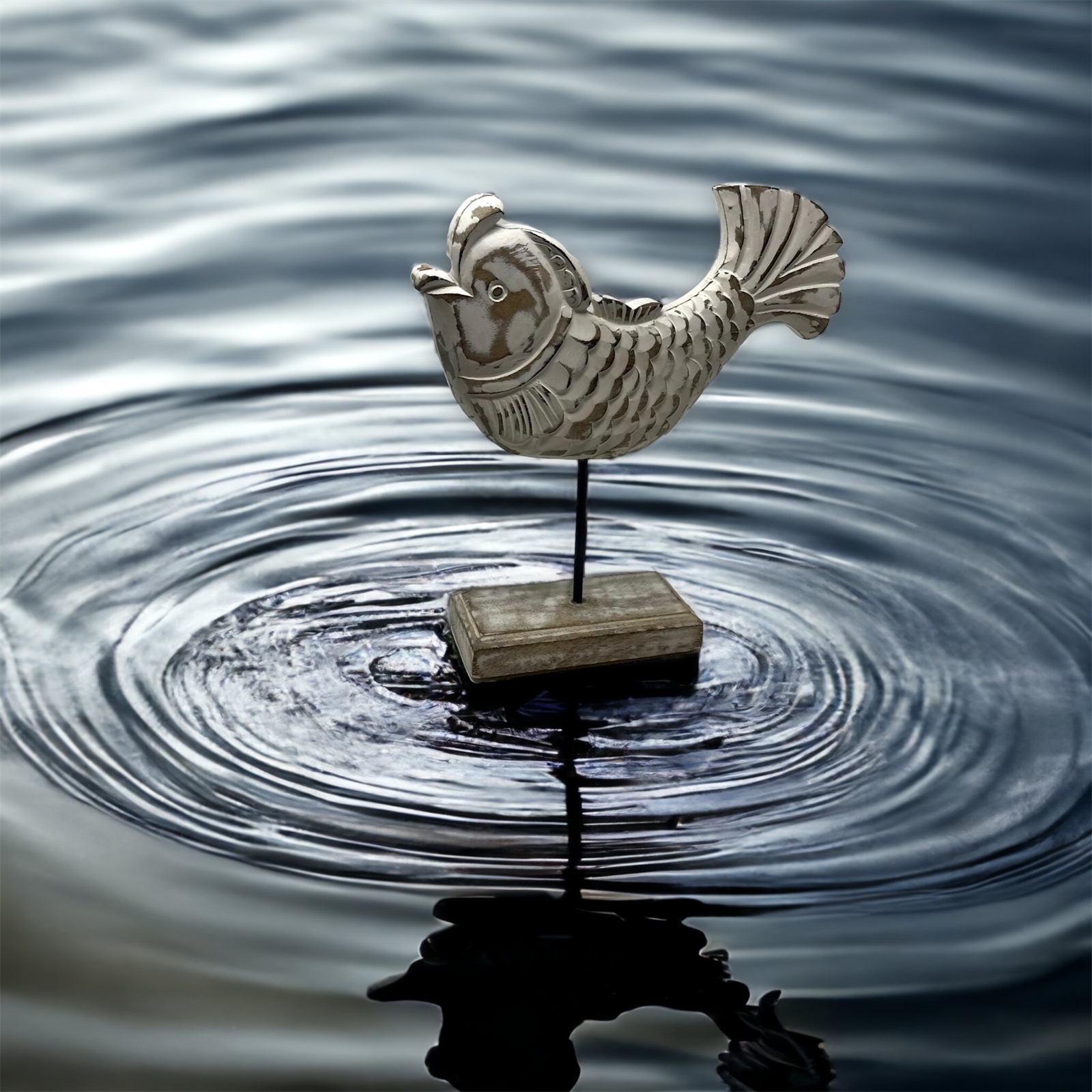Carmen Koi fish from our collection Fish Tales - hand-carved mango wood fish sculpture mounted on a post and pedestal base made by skilled Indian artisans and hand-finished in a white distressed patina. Each figure is named adding a unique touch to this stunning collection.