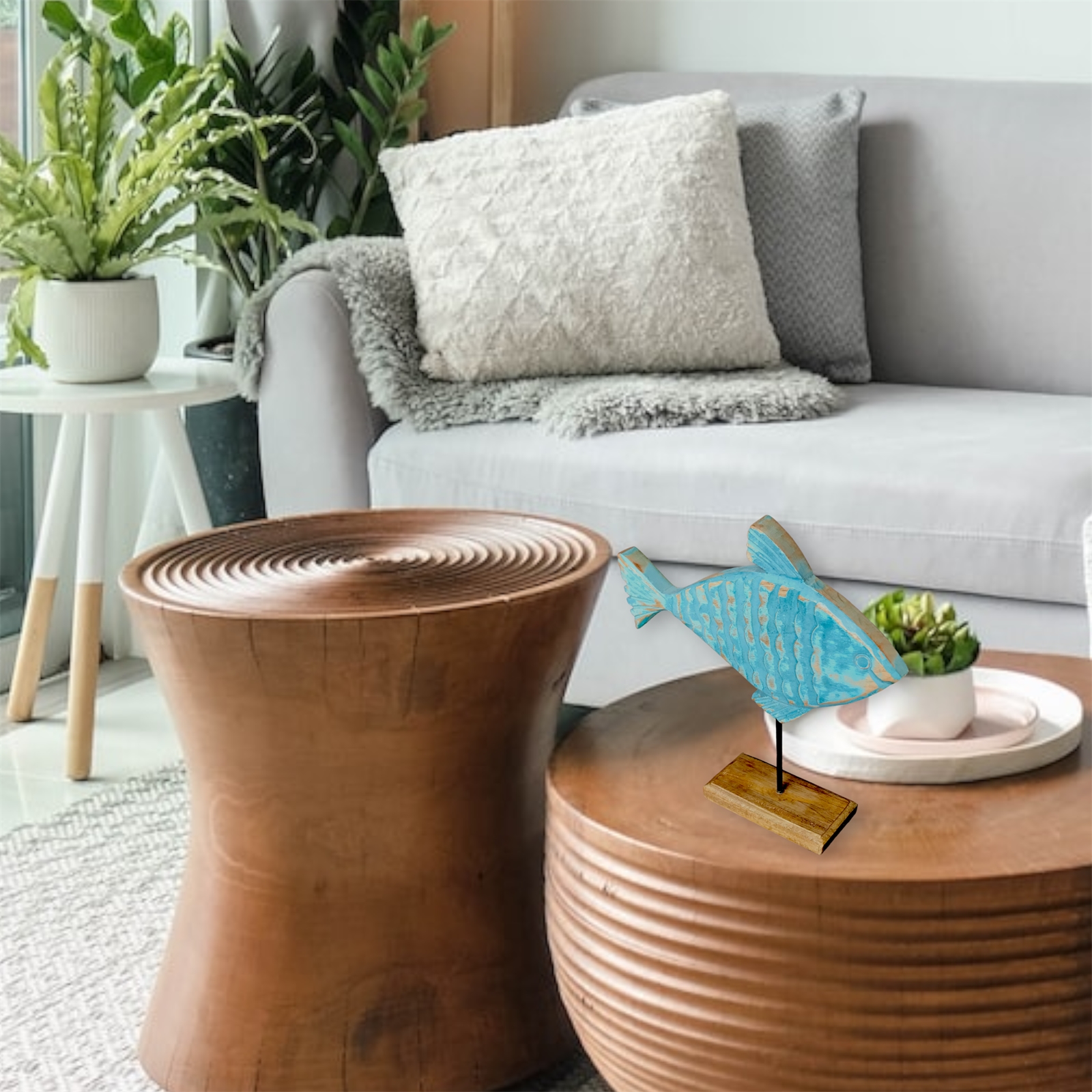 Sammy Surgeon Fish from our collection Fish Tales - hand-carved mango wood fish sculpture mounted on a post and pedestal base made by skilled Indian artisans and hand-finished in a light grey/blue patina. Each figure is named adding a unique touch to this stunning collection.