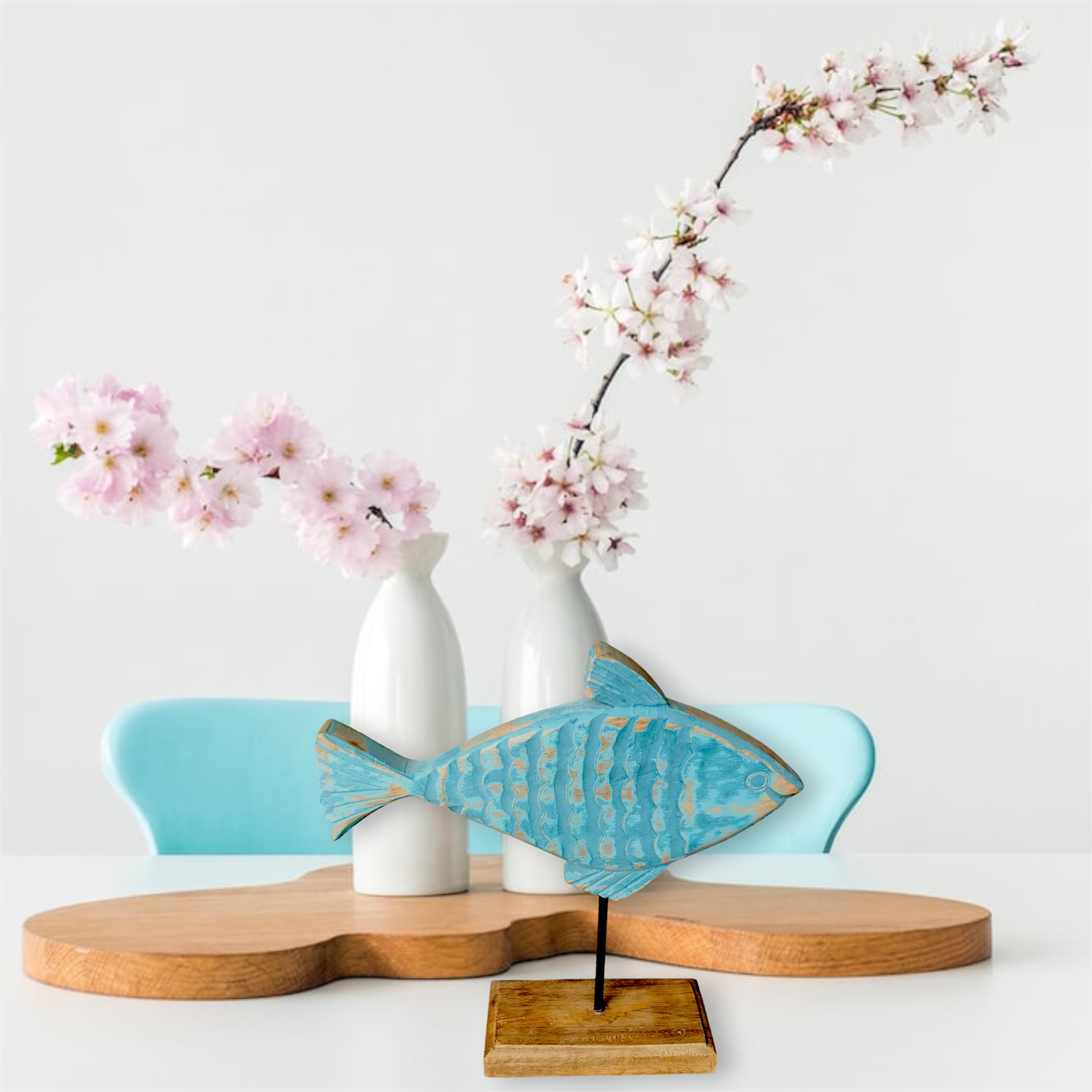 Measuring 10.5 wide x 3 deep x10 high these fish statues are the perfect addition to any coastal lake farmhouse or cabin-themed decor. Their intricate carvings and natural mango wood texture give them a rustic charm that is sure to impress your customers.