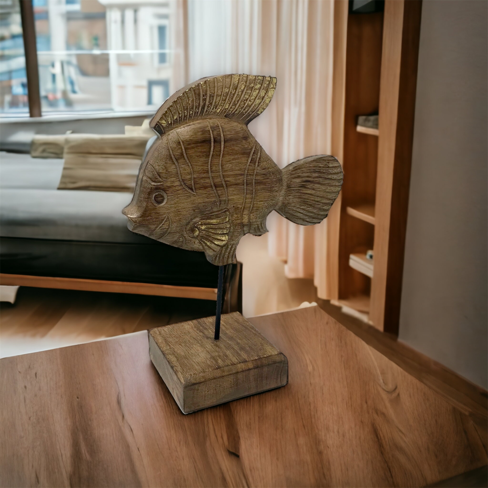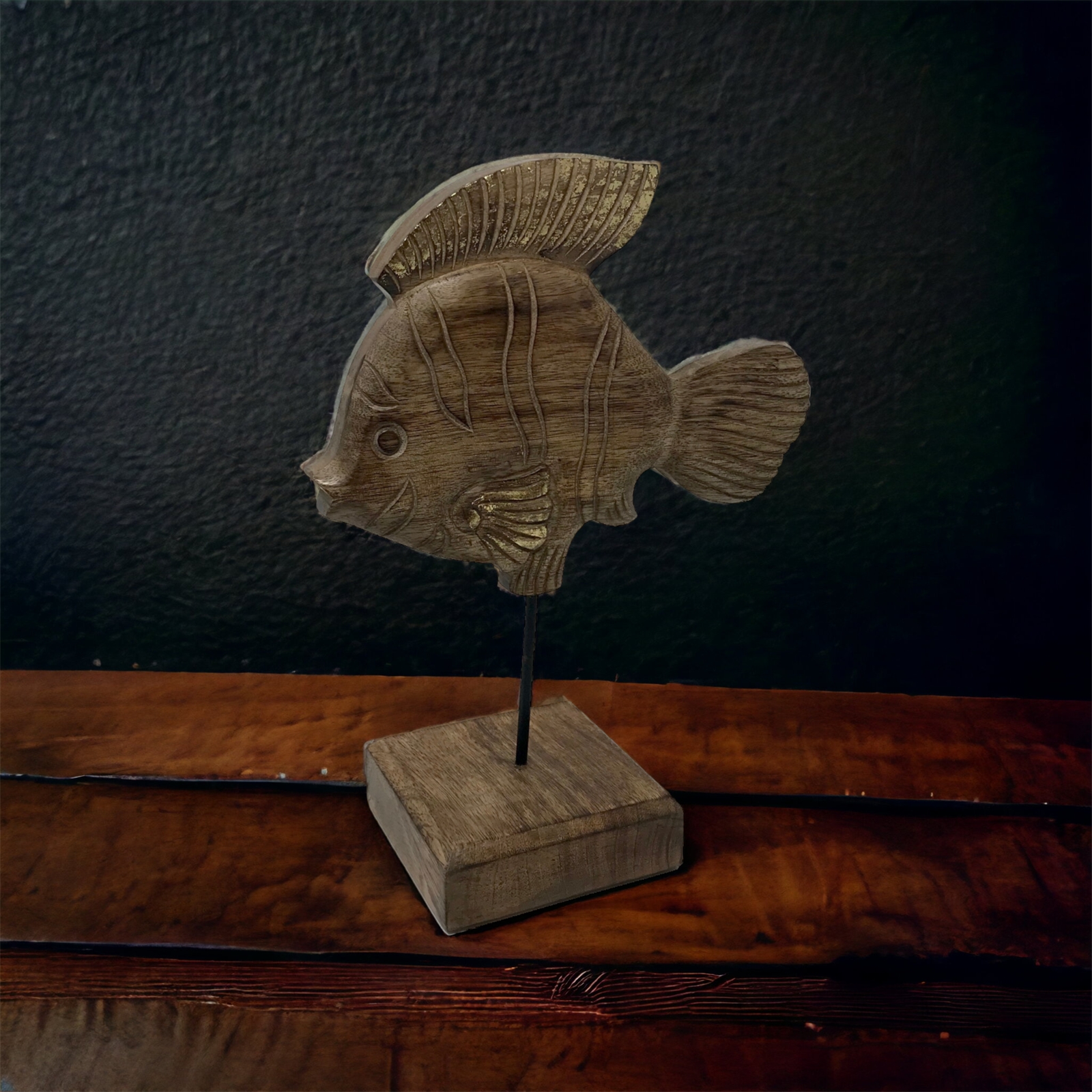 Cloe Clown Fish from our collection Fish Tales - hand-carved mango wood fish sculpture mounted on a post and pedestal base made by skilled Indian artisans and hand-finished in a honey stain with gold foil patina. Each figure is named adding a unique touch to this stunning collection.