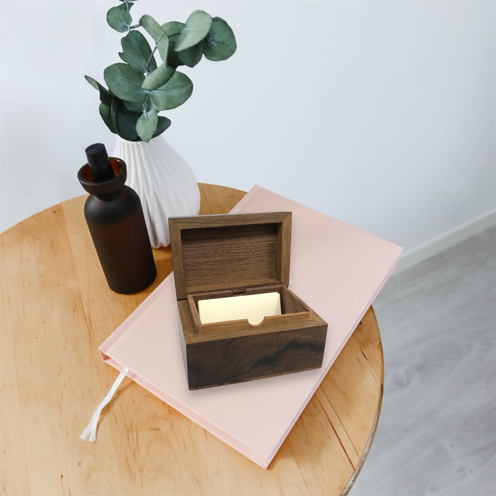 Discover our exquisitely handcrafted Acacia Wood Hinged Business Card Box from India. This beautifully designed box measures 5X3X2.75h and boasts rounded edges for a touch of elegance. Inside youll find acacia wood inserts with convenient finger cut-outs allowing for effortless card retrieval. The non-skid pads on the bottom ensure stability and prevent slipping. Crafted with attention to detail this box offers a sleek canvas for personalization through engraving. Enhance your professional image and make a lasting impression with this sophisticated Acacia Wood Hinged Business Card Box.