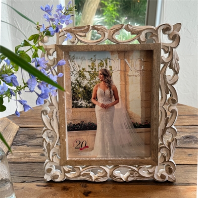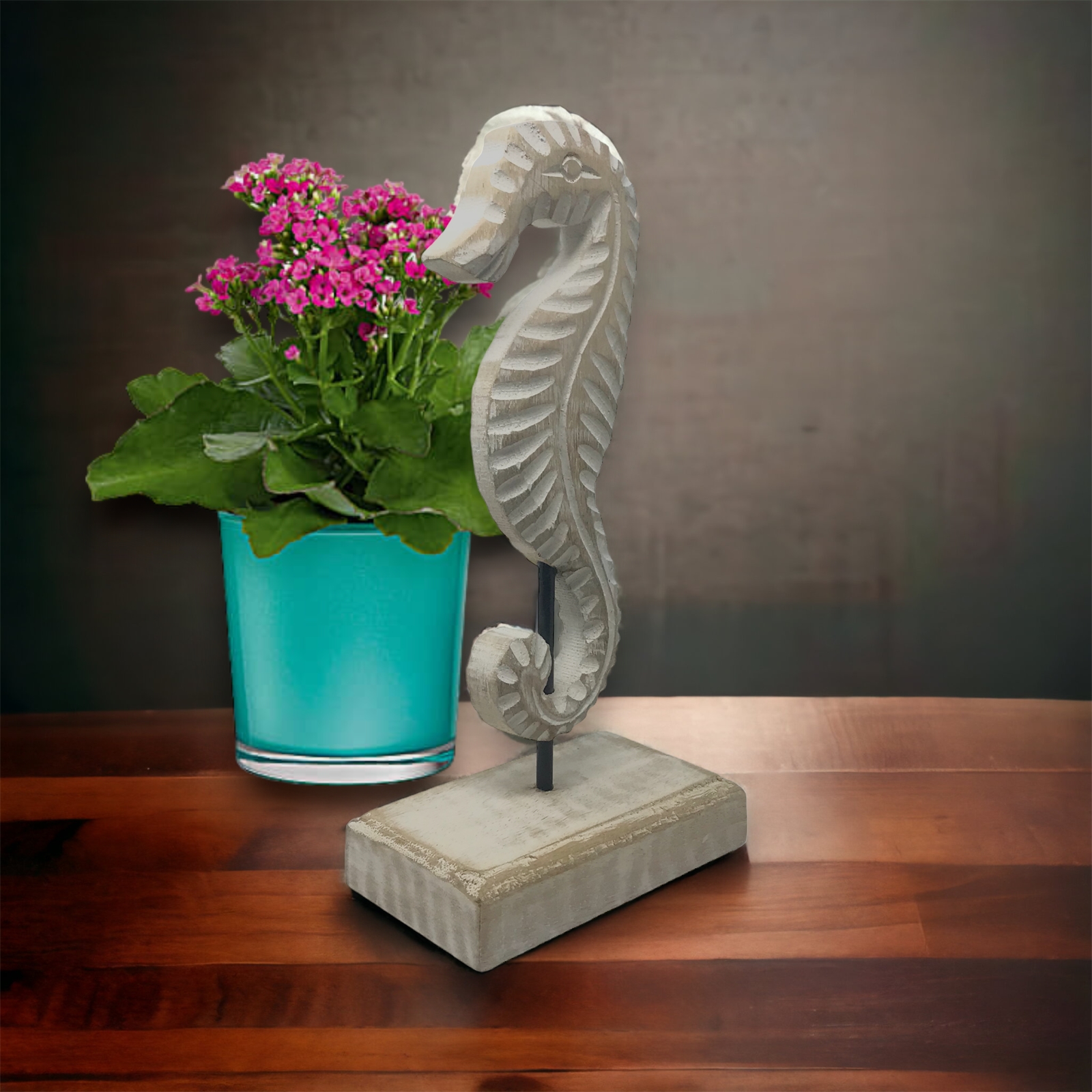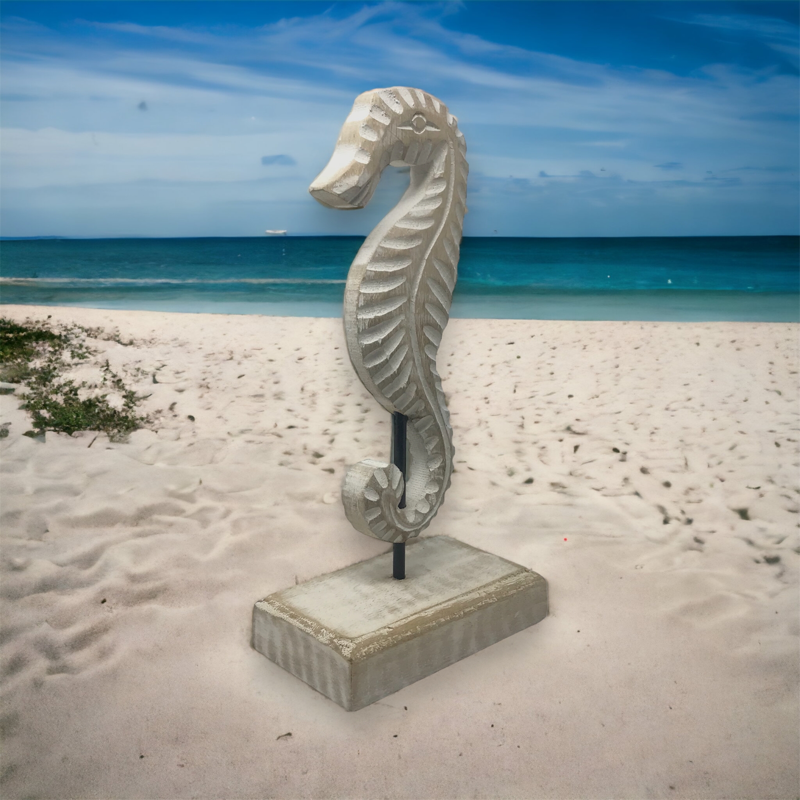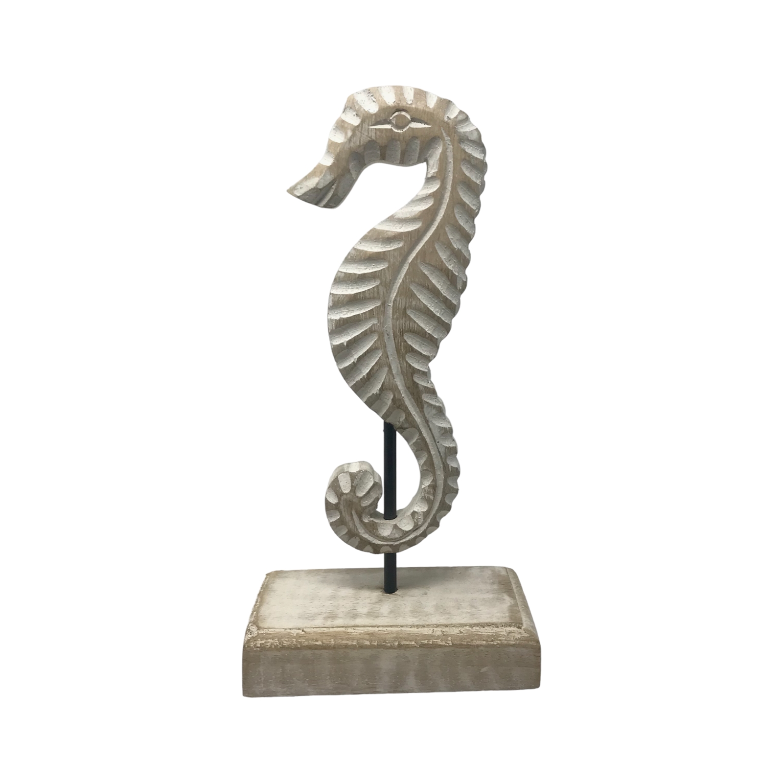 Introducing our stunning double-sided hand-carved seahorse figure a true masterpiece of artistry. Expertly crafted from the finest mango wood by skilled artisans in India this seahorse showcases exceptional attention to detail and exquisite craftsmanship. Mounted on a wood base the figure features a unique design element—a metal rod that creates the illusion of the seahorse gracefully clinging to it. Measuring 5.25x2.75x10h this enchanting piece is perfectly sized to be a captivating focal point in any room. With its 360-degree carving every angle reveals lifelike textures and intricate details showcasing the true beauty of this remarkable creation. Embrace the allure of the ocean and elevate your home decor with this extraordinary seahorse figure with this extraordinary seahorse figure hand-finished in a whitewash patina.