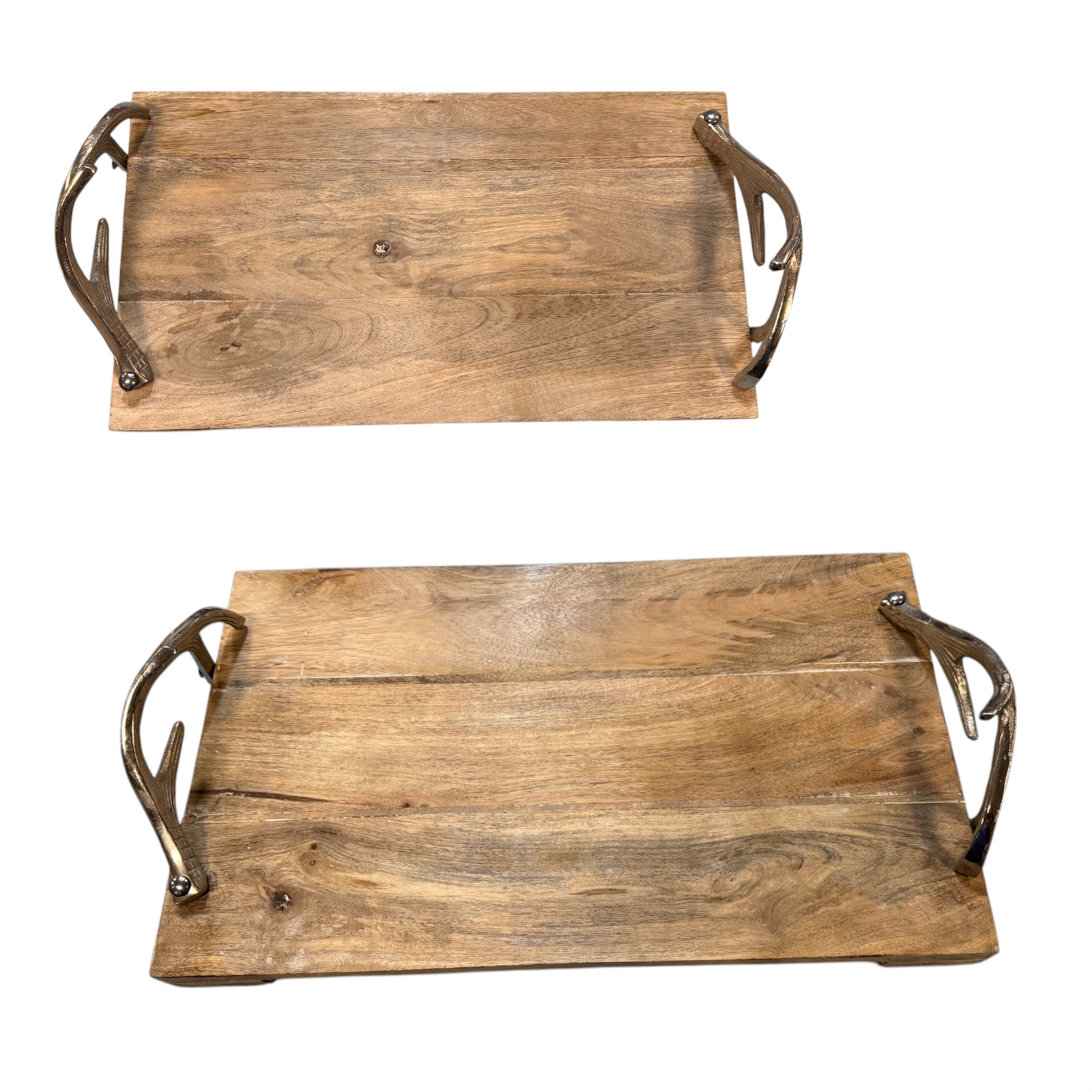 Both trays are elevated with two solid mango wood slat feet, offering visual impact and stability while protecting surfaces.
