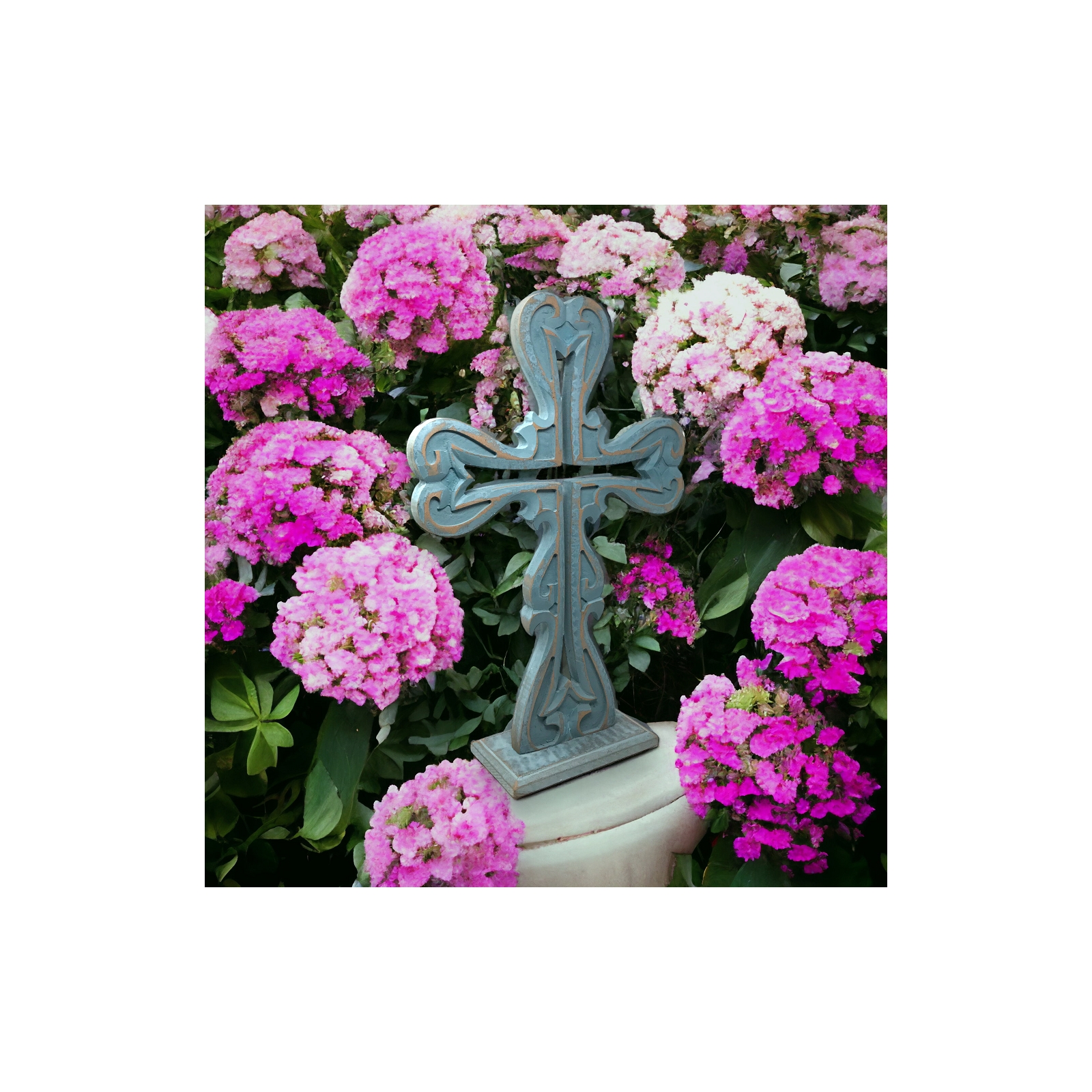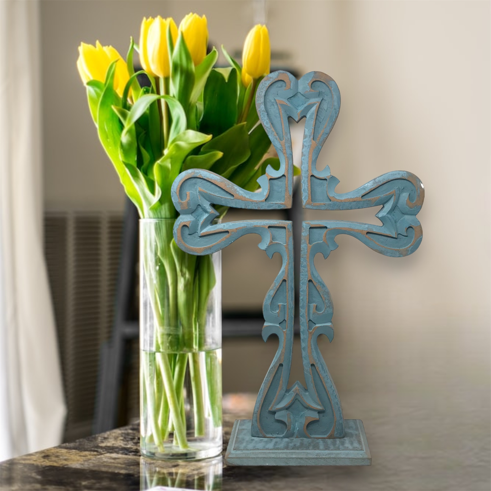The cross is finished with a distressed light blue patina adding a rustic charm and a sense of timeless beauty. Its 12x4x18.5 size makes it a perfect centerpiece effortlessly drawing attention and becoming a focal point in any room.
