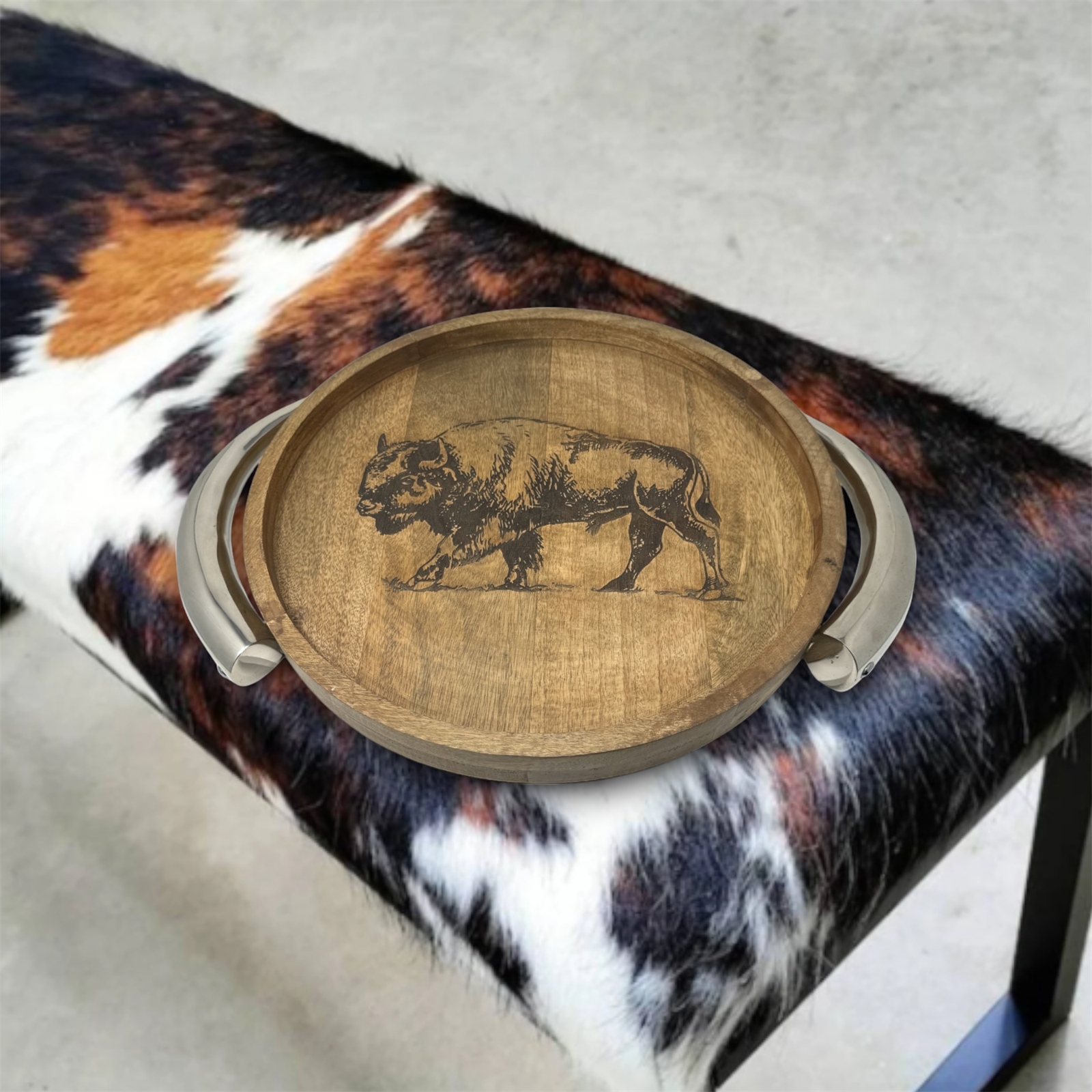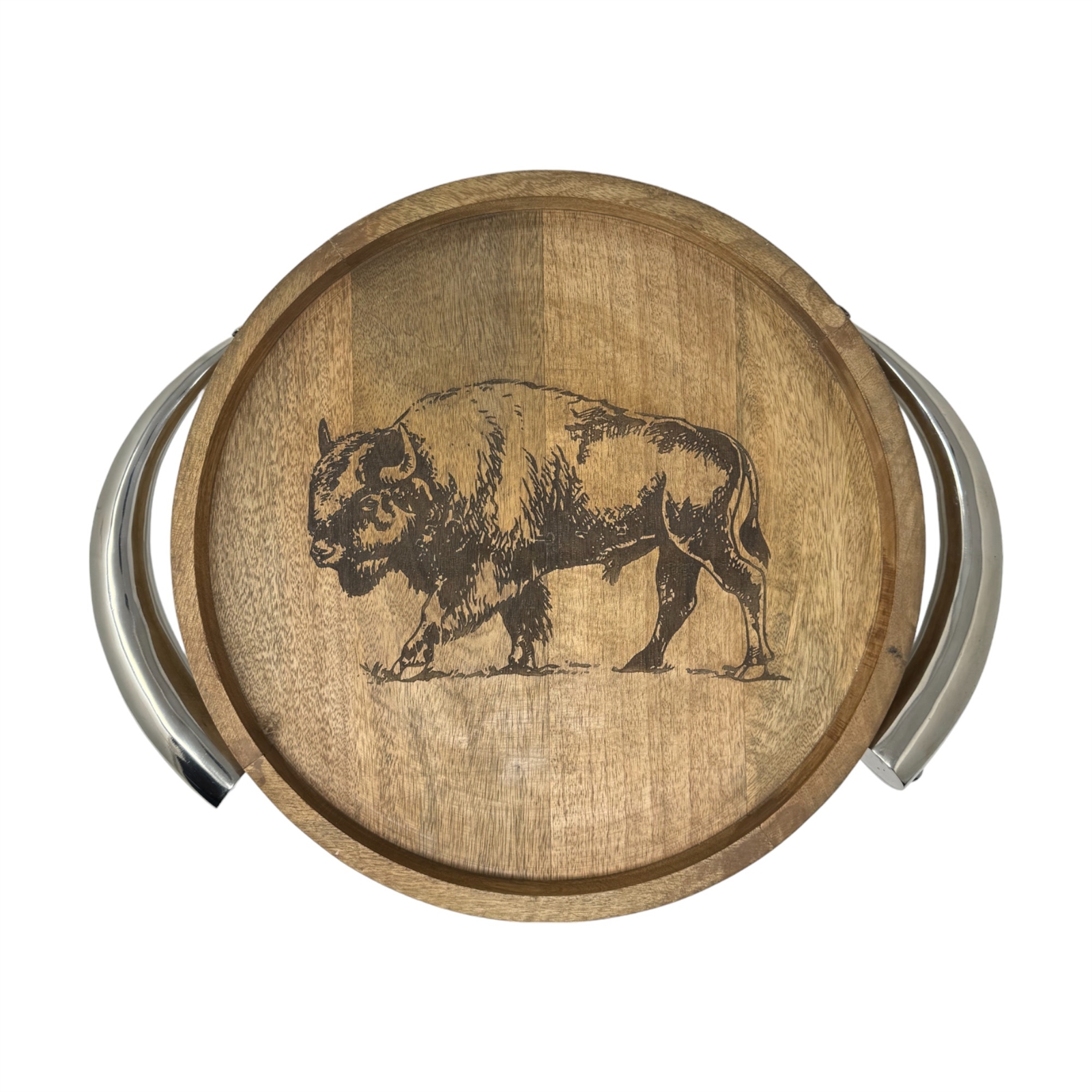 The tray boasts a rich, honey-stained finish that enhances the natural beauty of the solid mango wood. At the center, a majestic Bison, intricately laser-etched, captures the spirit of the American frontier, adding a touch of rustic charm to your serving experience. The charcoal burn detailing around the Bison imparts a sense of authenticity and depth to the design.