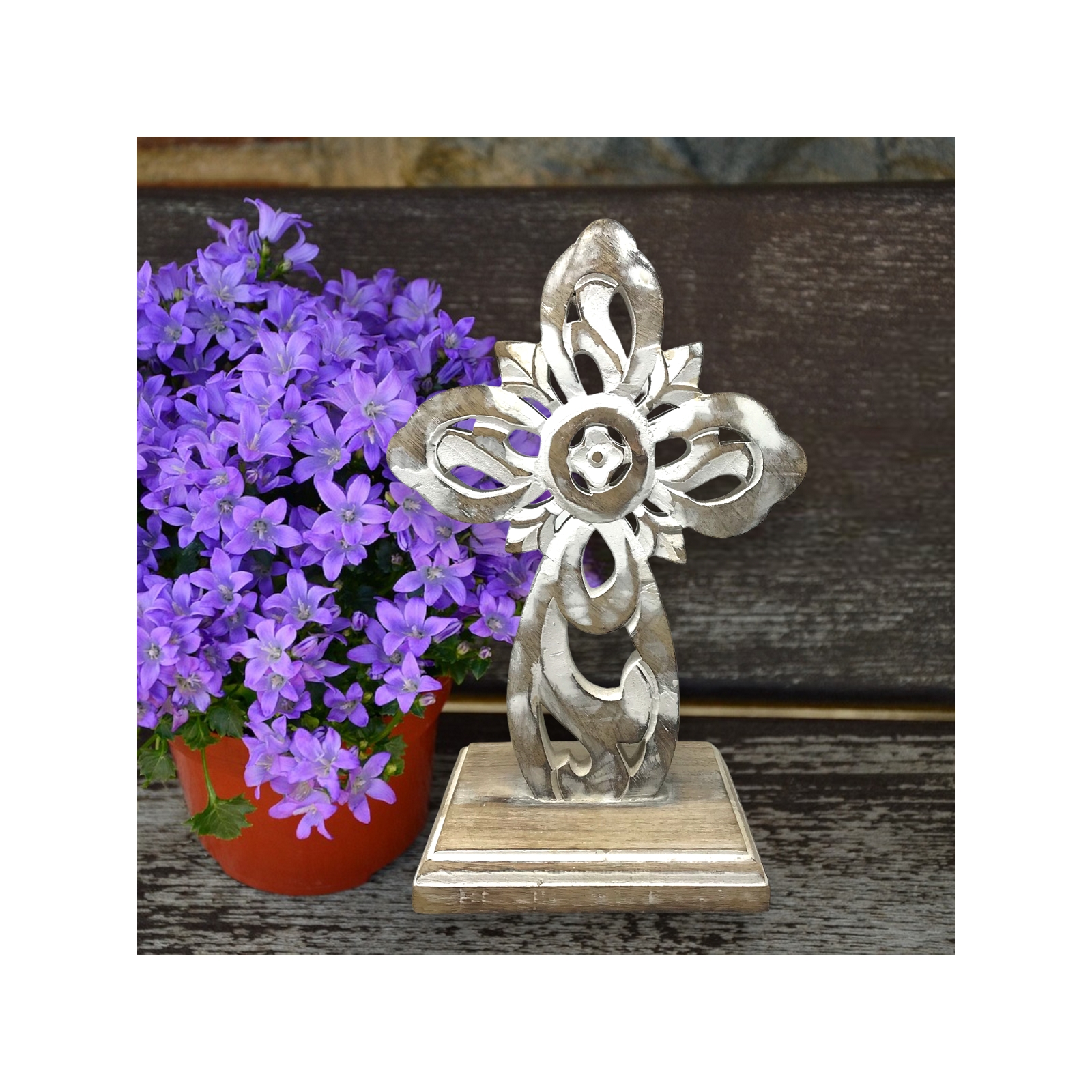 Each individual detail on the cross reflects the dedication and artistry of skilled Indian artisans. The intricate chip carving technique reveals delicate patterns floral motifs and ornate filigree lending an air of reverence and serenity to this sacred symbol. The combination of the skilled craftsmanship the natural beauty of mango wood and the distressed finish makes this Mango Wood San Cristobal Table Cross a truly unique and captivating piece of art.