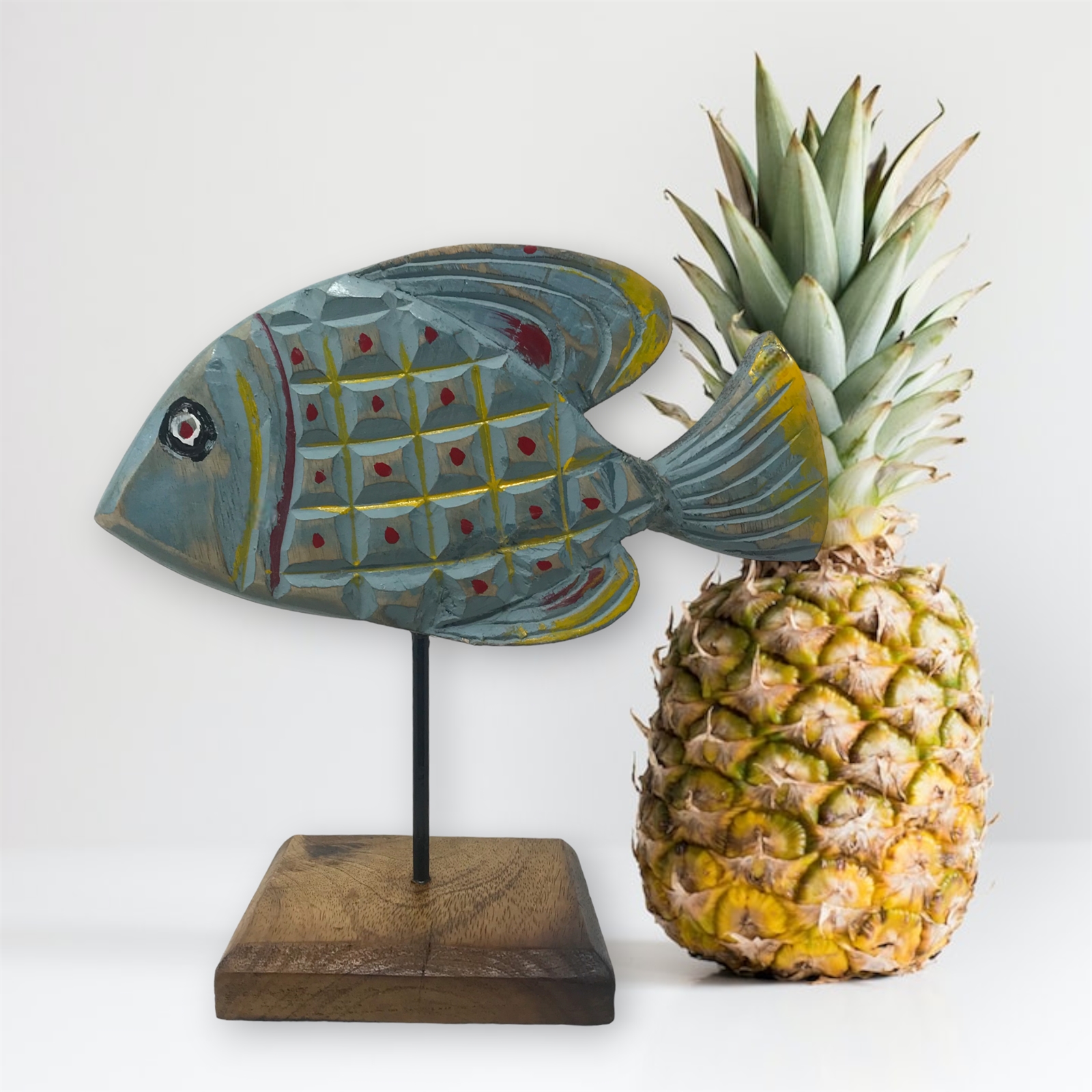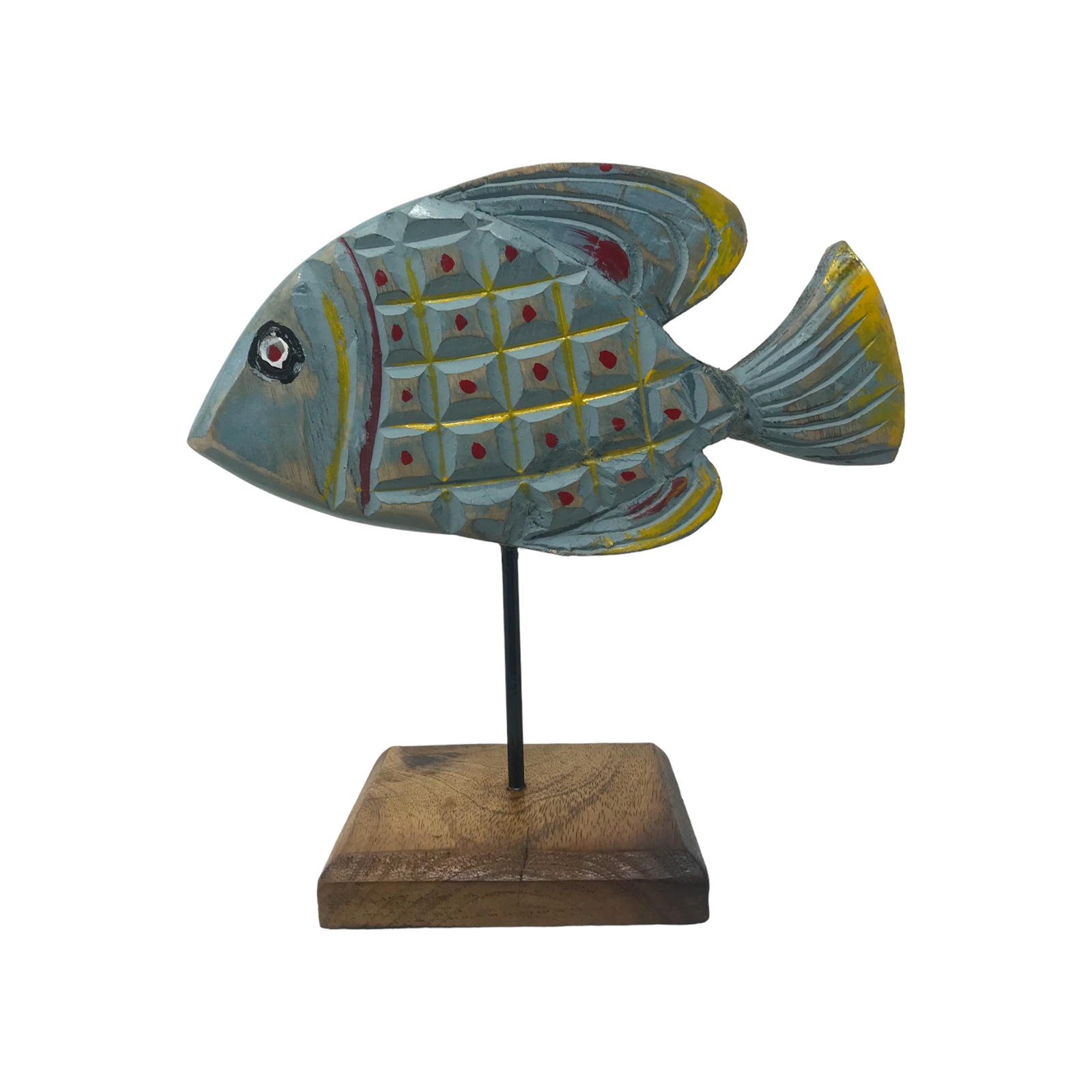Introducing Bobby a captivating Mango Wood Hand-Carved Bass Fish sculpture skillfully crafted in India. This remarkable artwork showcases the talent and expertise of artisans meticulously carved from luxurious mango wood. Bobby proudly stands on a solid mango wood base securely attached with a metal rod ensuring stability and longevity. The base is thoughtfully designed with rubber no-slip cushion pads providing a secure grip while protecting surfaces. With dimensions of 9.75x5x10 high Bobbys presence commands attention while seamlessly fitting into any space. Hand-painted in vibrant hues of red and yellow artfully applied on top of a celeste blue base this sculpture exudes a timeless worn vintage appeal. The intricate carving on all sides showcases the attention to detail and craftsmanship. Bobby the Mango Wood Hand-Carved Bass Fish promises to be a cherished addition to your home infusing it with elegance artistry and a touch of nostalgic beauty.