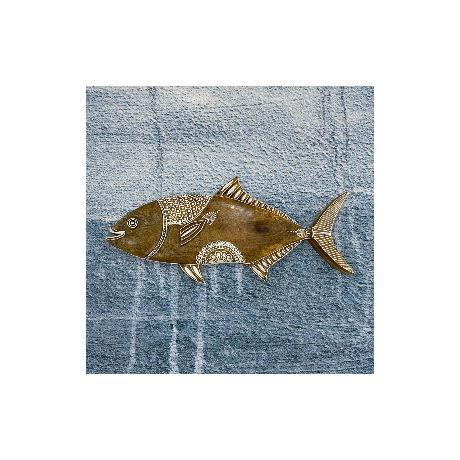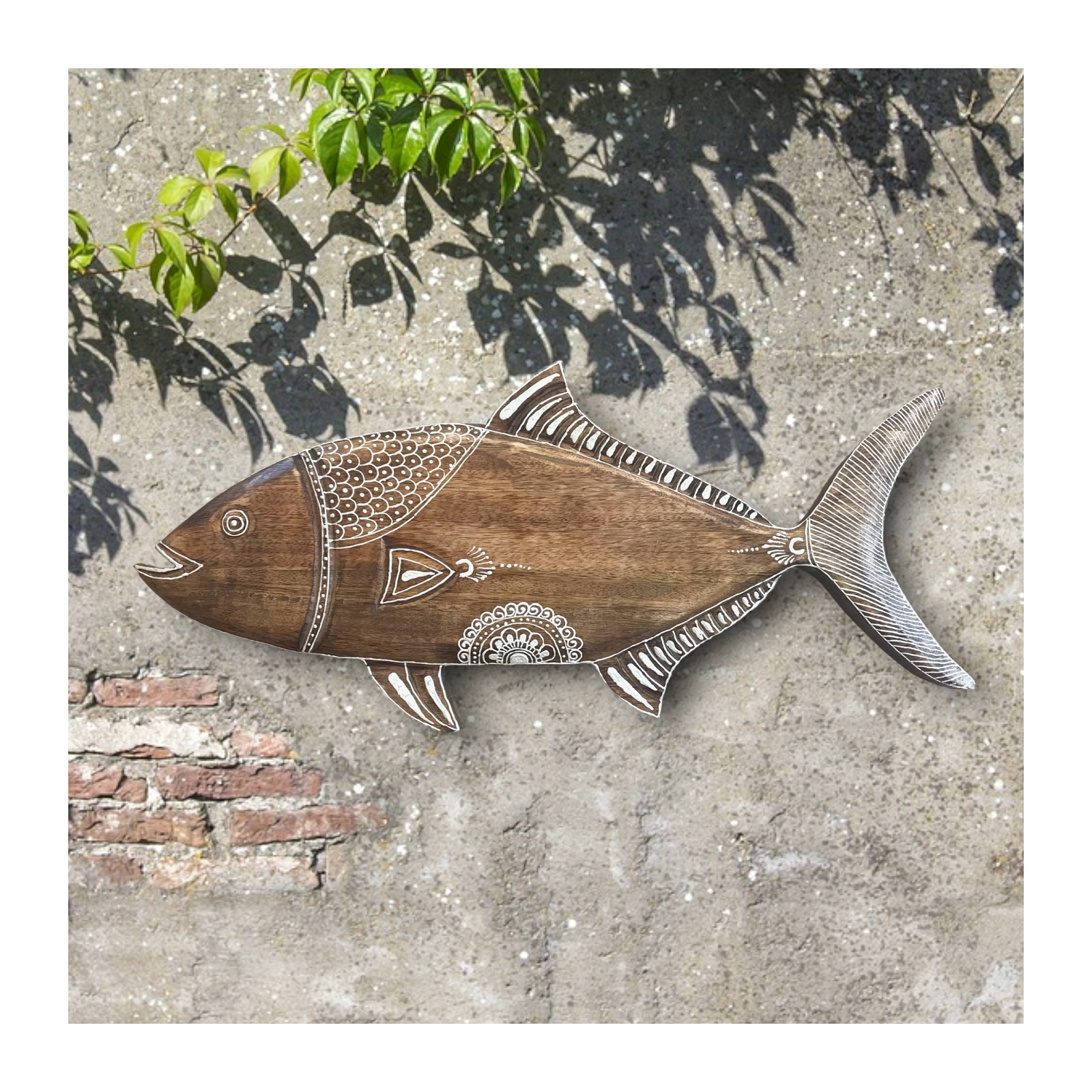 Introducing the exquisite hand-carved Mango Wood Amber Jack hanging wall sculpture from India. Crafted from a single piece of mango wood this masterpiece measures 26.5 wide x 12 high and 2 deep. Its rich Dark Pecan Finish beautifully complements the intricate carving highlighted by delicate hand detailing and enhanced with White Henna accents. The skillful implementation of the henna technique mastered in India magnifies the sculptures stunning intricacies. Weighing an impressive 7 lbs this wall art exudes a captivating presence. Securing it to your wall is effortless thanks to two keyhole hangers. Immerse yourself in the timeless beauty and craftsmanship of this remarkable piece.