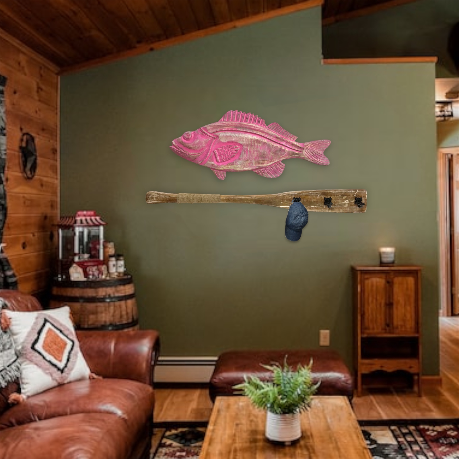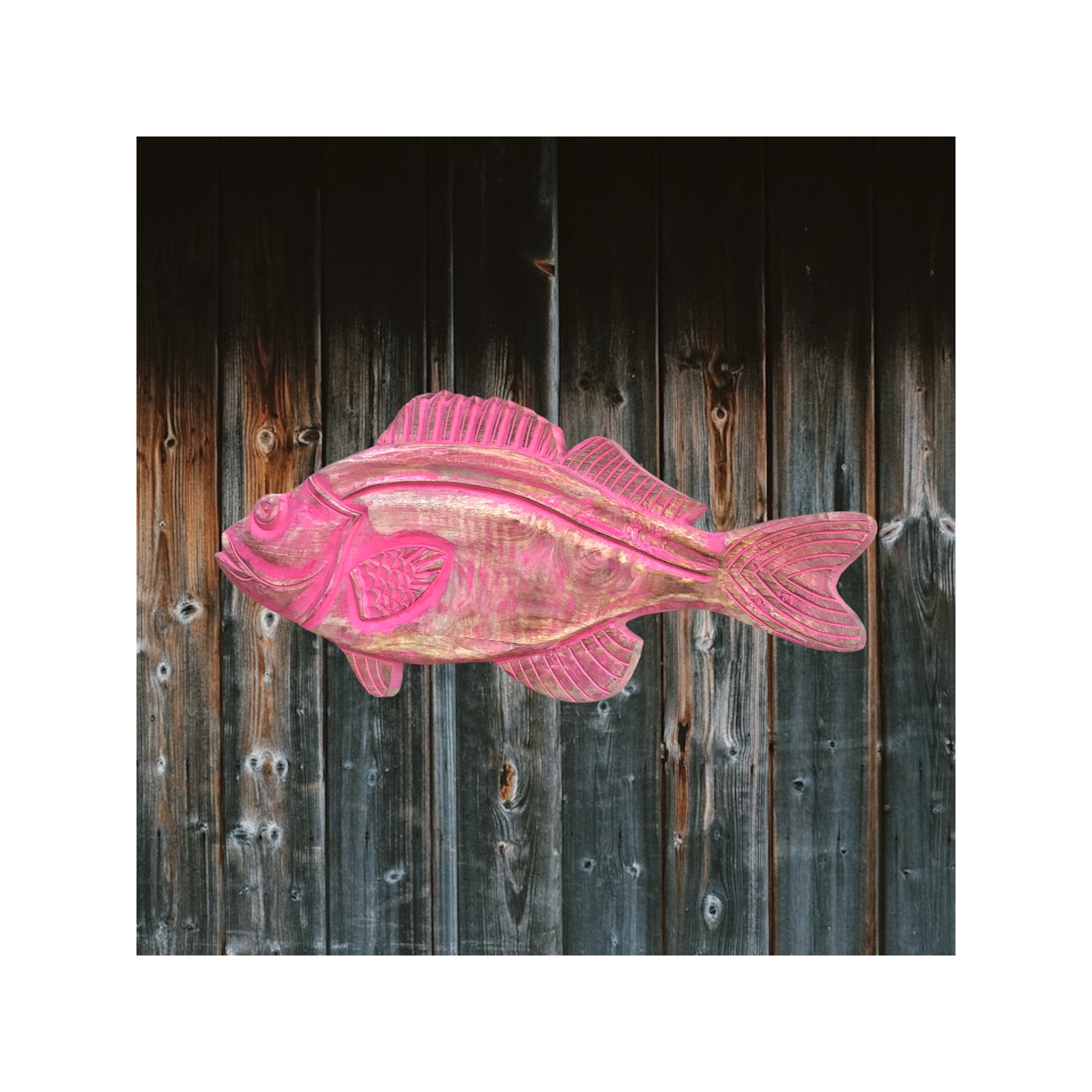 The hand-carved mango wood Snook hanging wall sculpture from India is a captivating masterpiece. Crafted from a single piece of mango wood it showcases exquisite artistry. Measuring 33 wide x 15.5 high and 3.5 deep its remarkable size commands attention. The distressed Fuchsia hand detailing adds a touch of vibrancy accentuating the intricately carved design. Weighing an impressive 10.5 lbs this wall art piece embodies both elegance and sturdiness. It serves as a striking statement in any space reflecting the skillful craftsmanship and cultural heritage of India. The sculpture attaches firmly in place on the wall using two keyhole hangers.