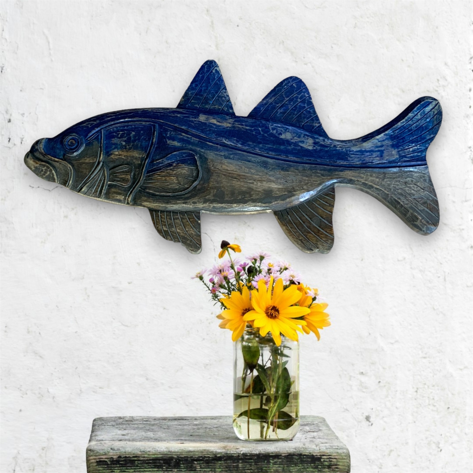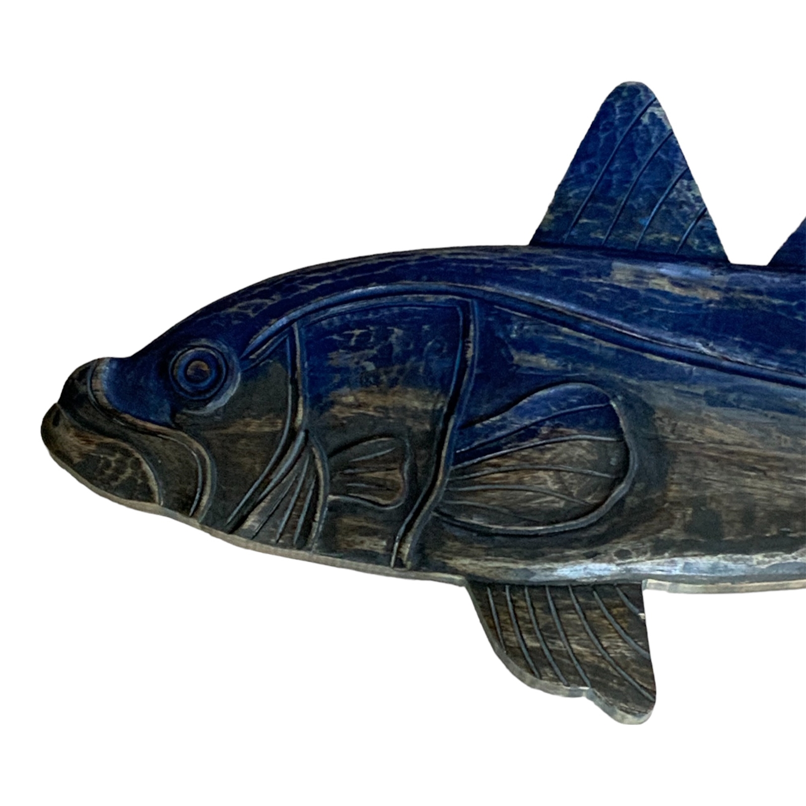 The hand-carved intricacies on this king mackerel art piece showcase the craftsmanship of our skilled artisans, bringing to life the dynamic contours and textures found in this remarkable fish. The distressed Cobalt Blue and Grey finish adds depth and character, highlighting the natural beauty of the mango wood.