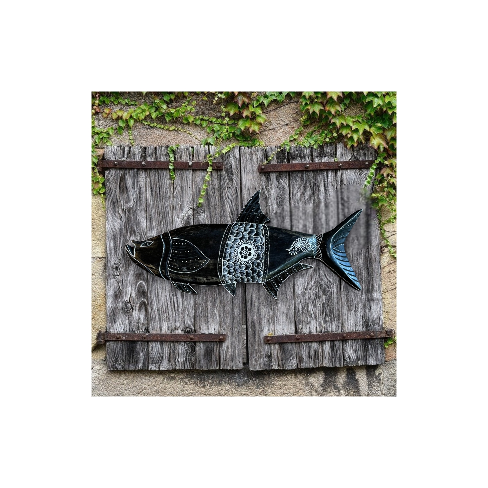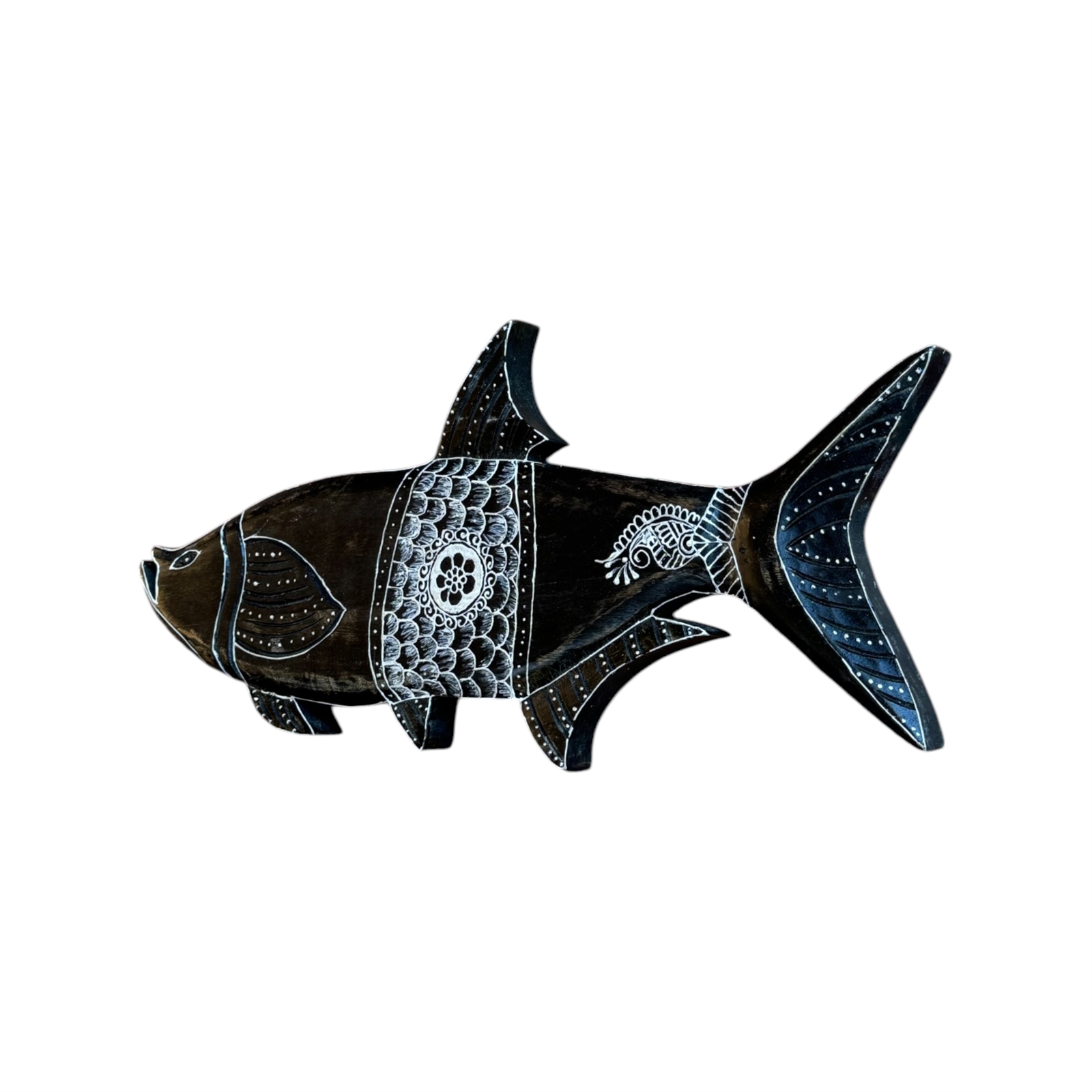 Keywords: Hand-carved Tarpon fish, mango wood wall decor, coastal decor, black sheen finish, Henna detailing, beach house decor, handmade in India, nautical wall art, artisan-crafted, coastal wall fish, unique home accents.