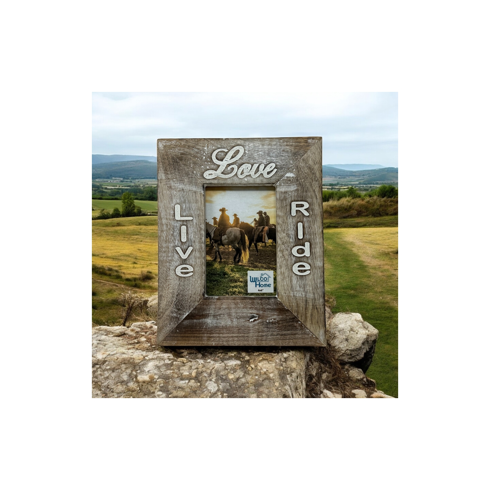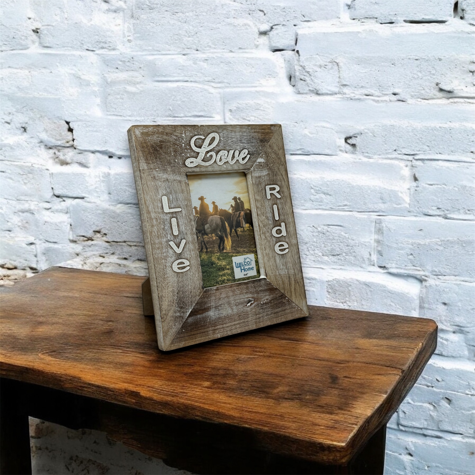 Celebrate your love for the open trail with our Live, Love, Ride Mango Wood Easel Frame. Handmade and laser-engraved with a heartfelt message in a mix of block and script fonts, this frame is the perfect way to showcase a cherished 4x6 photo.