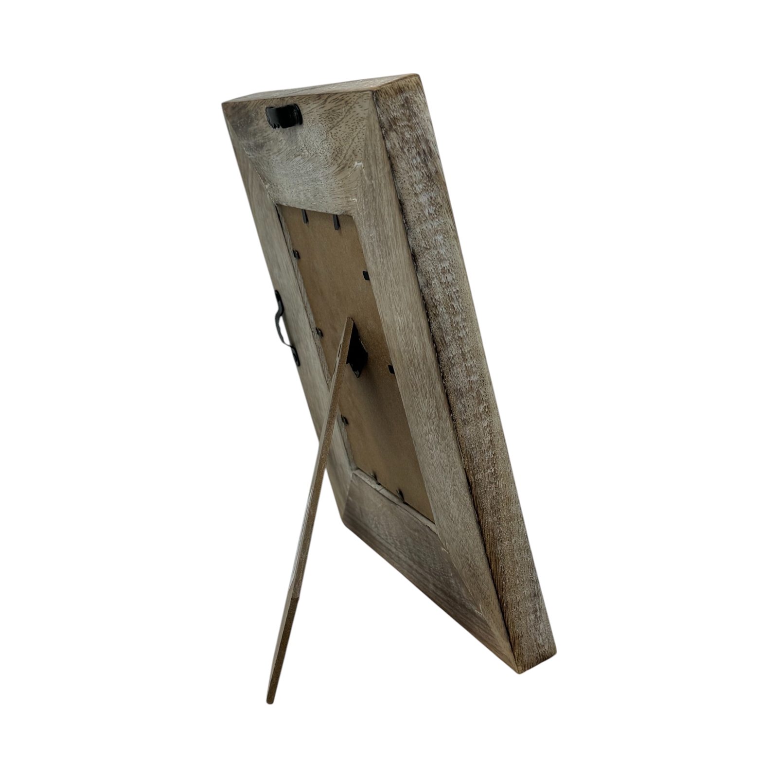 The frames whitewashed finish over a dark base highlights the laser etching, giving it a charming rustic appeal. Measuring 8.25 wide x 10.25 high x 3/4 thick, it’s ideal for rustic, western, cabin, or farmhouse decor. Featuring a sturdy hinged easel for tabletop display and a sawtooth hanger for wall mounting, this versatile frame is a beautiful addition to any space. Handmade in India with care and craftsmanship.