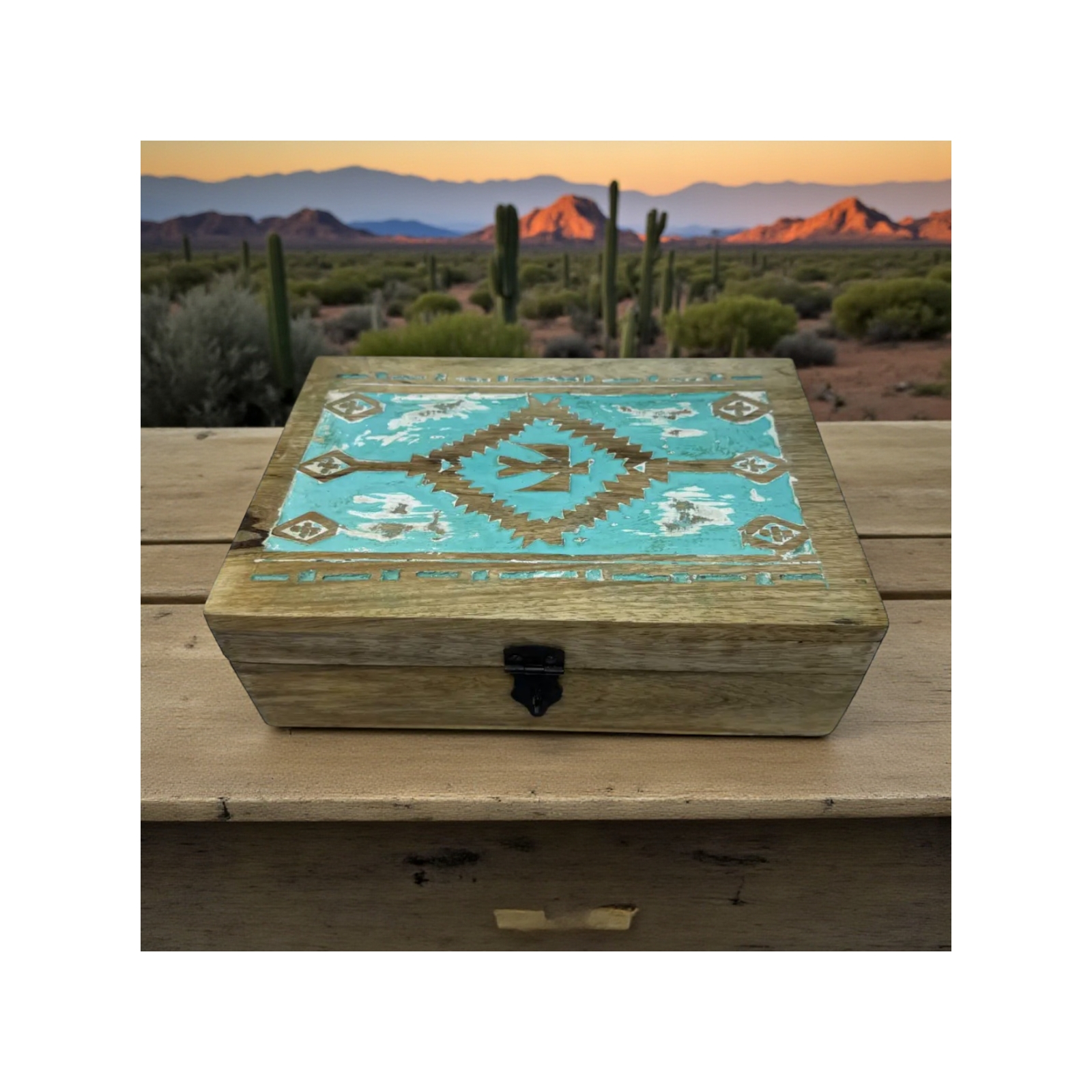 The box showcases intricate geometric hand-carved designs on the lid, inspired by the rich traditions of the Navajo Indians. The natural honey-stained wood beautifully contrasts with the turquoise blue weathered finish, which accents the carved under-relief, creating depth and a rustic, heirloom-like appeal.