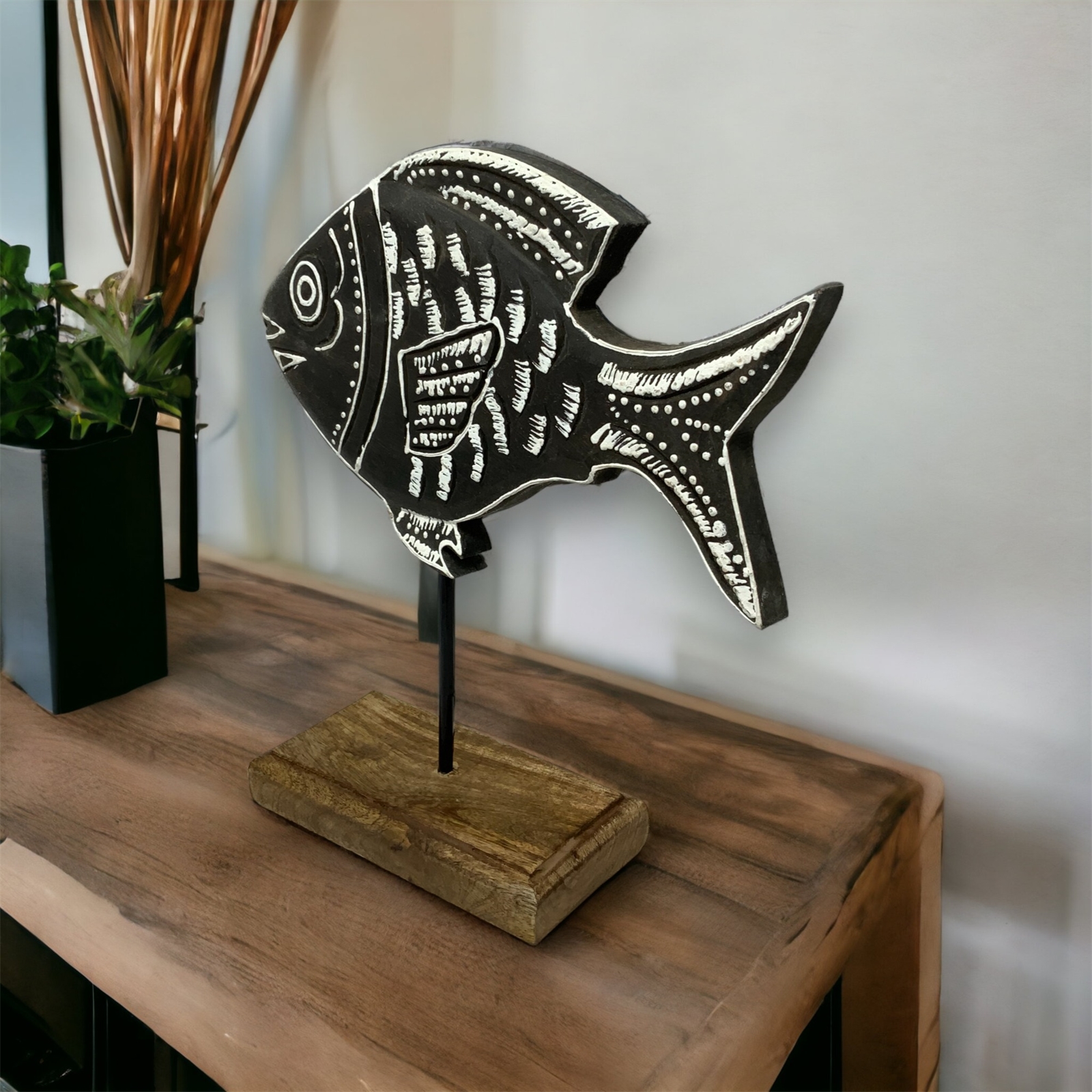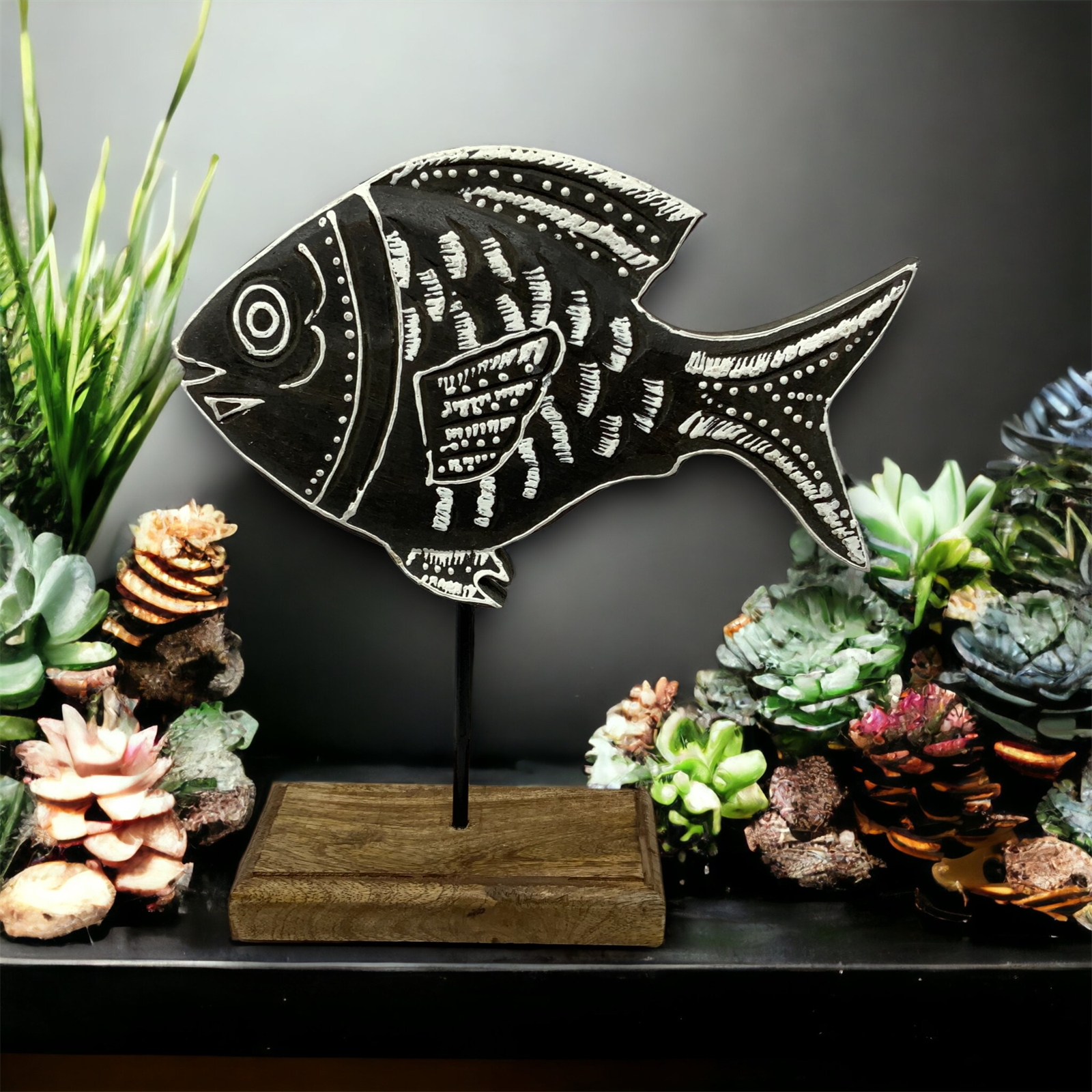 Introducing Black Sparrow from our Fish Tales Collection – a captivating hand-carved wood tabletop sculpture that seamlessly merges artisanal craftsmanship with coastal charm. This exquisite fish, mounted on a wooden pedestal with a sturdy metal rod, is a testament to the skilled artisans in India who bring this piece to life.