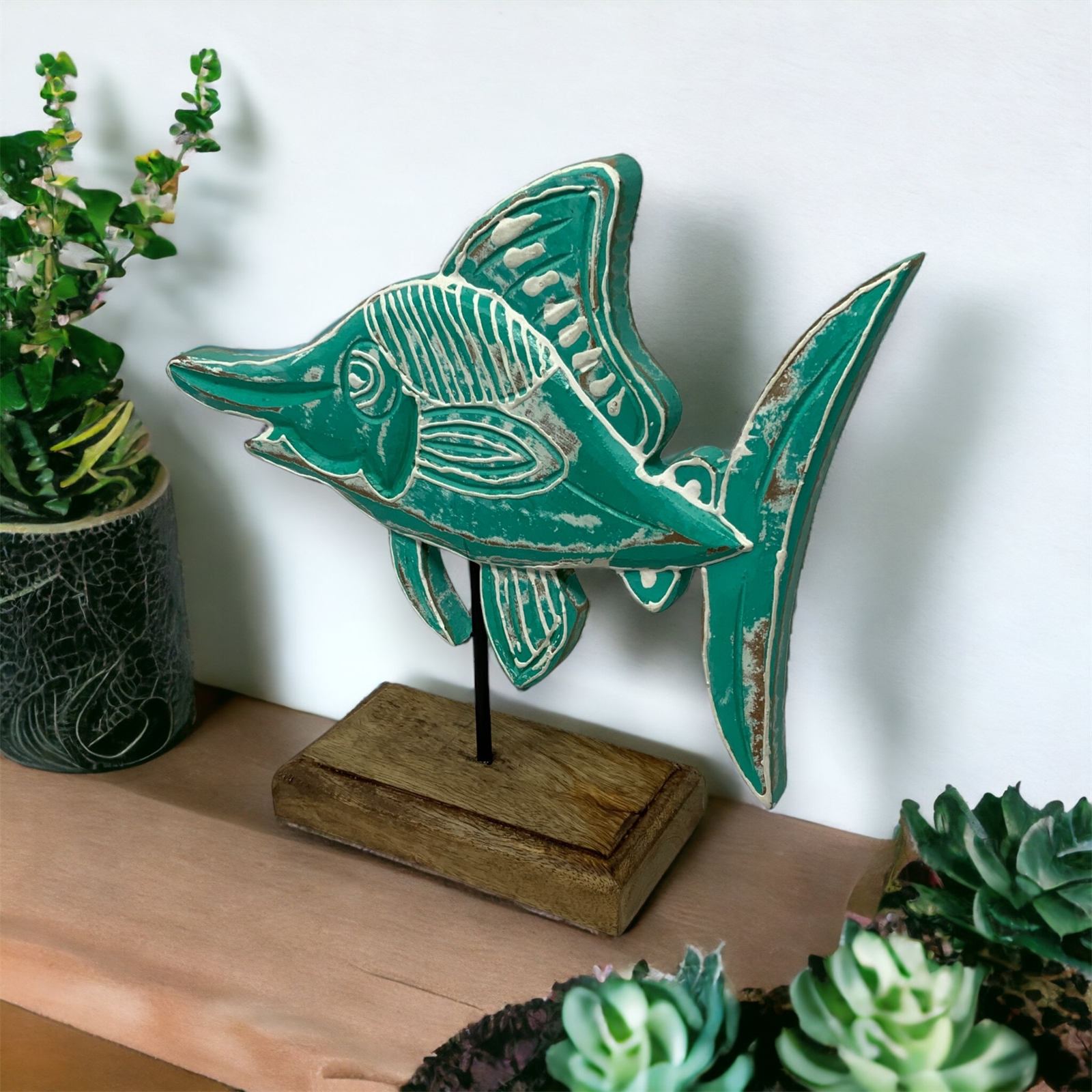Introducing Maury Marlin from our Fish Tales Collection – a captivating hand-carved wood tabletop sculpture that seamlessly merges artisanal craftsmanship with coastal charm. This exquisite fish, mounted on a wooden pedestal with a sturdy metal rod, is a testament to the skilled artisans in India who bring this piece to life.