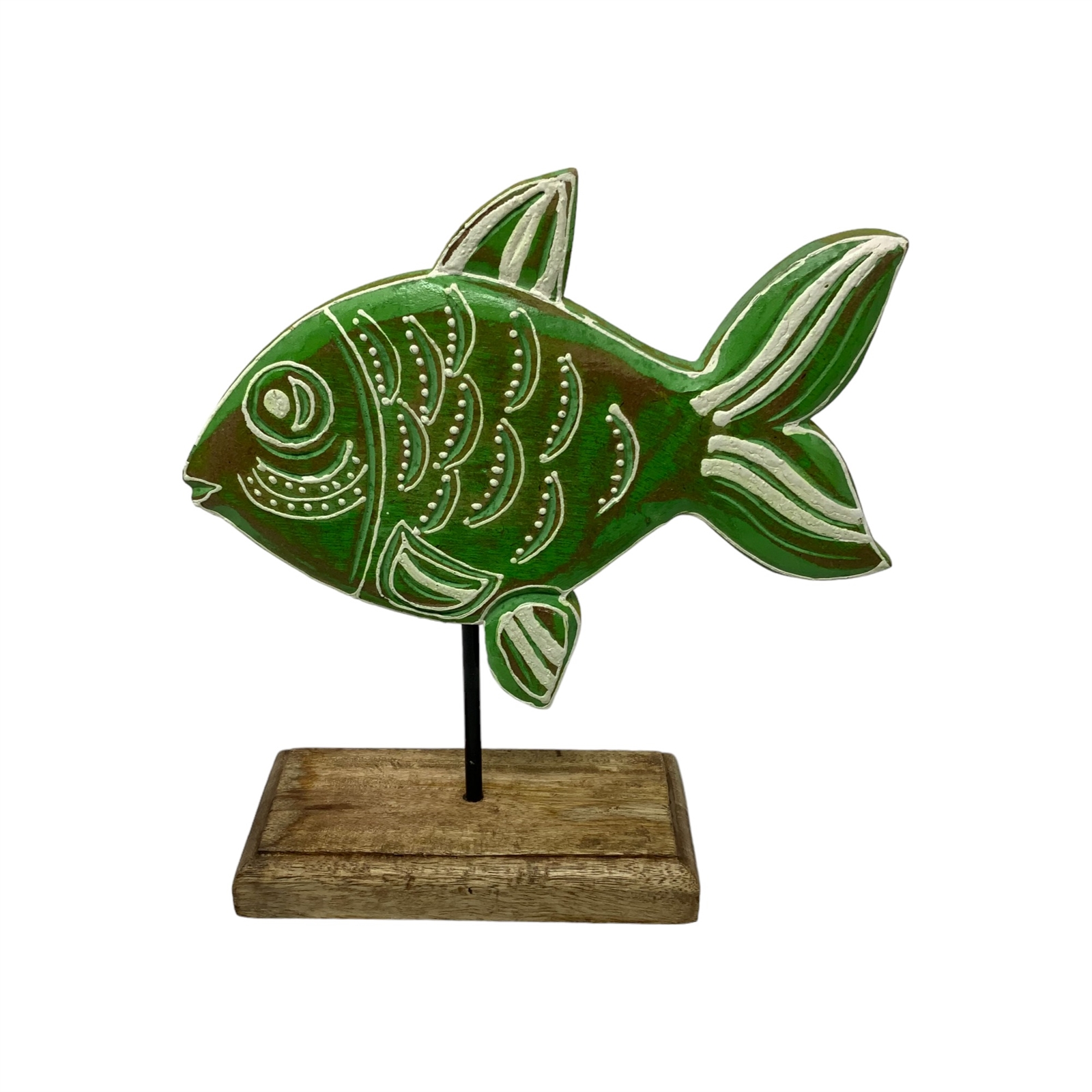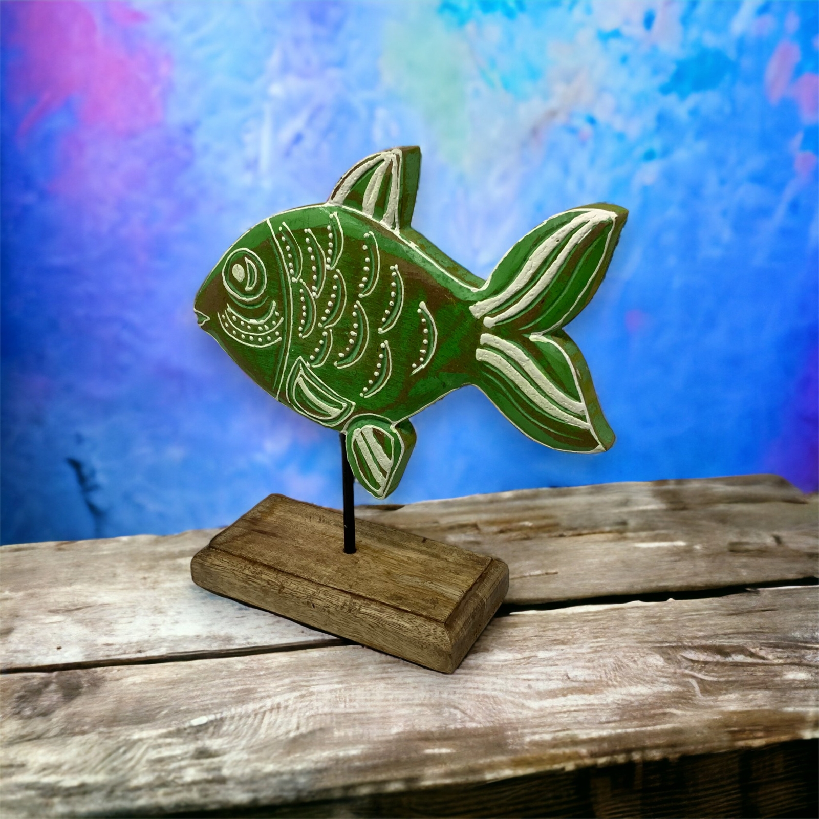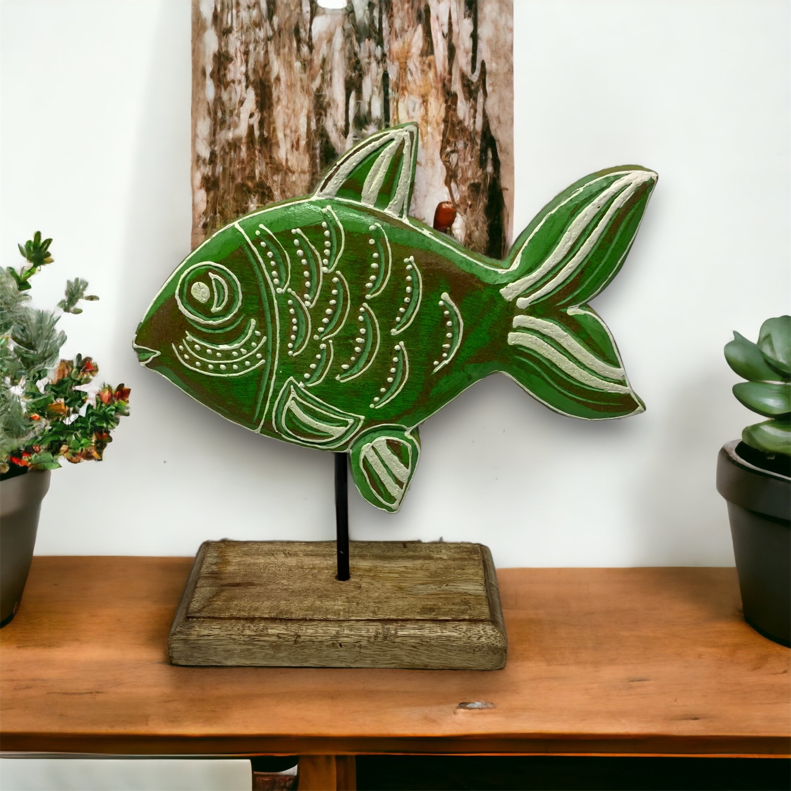 Introducing Larry Lime from our Fish Tales Collection – a captivating hand-carved wood tabletop sculpture that seamlessly merges artisanal craftsmanship with coastal charm. This exquisite fish, mounted on a wooden pedestal with a sturdy metal rod, is a testament to the skilled artisans in India who bring this piece to life.