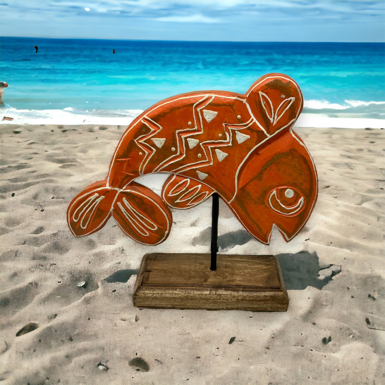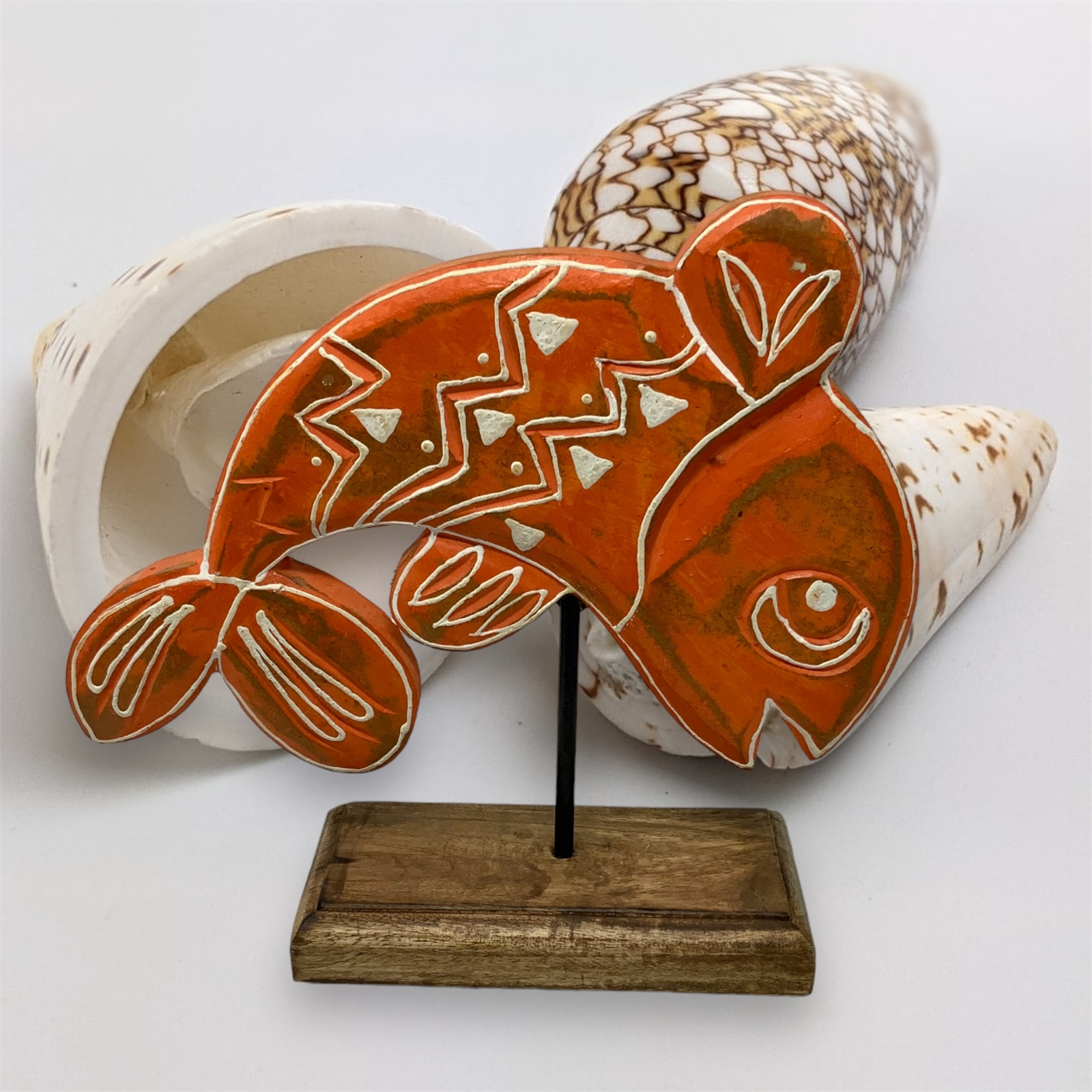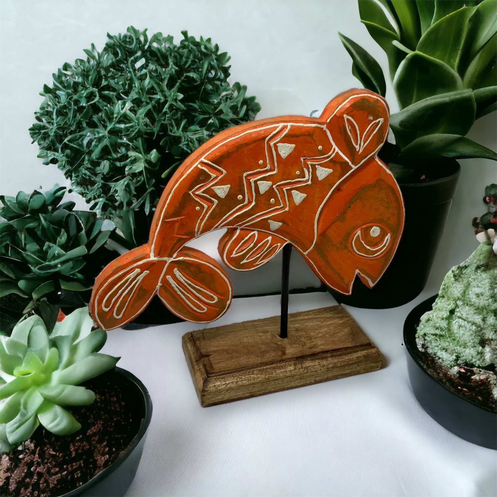 Introducing Tangerine from our Fish Tales Collection – a captivating hand-carved wood tabletop sculpture that seamlessly merges artisanal craftsmanship with coastal charm. This exquisite fish, mounted on a wooden pedestal with a sturdy metal rod, is a testament to the skilled artisans in India who bring this piece to life.