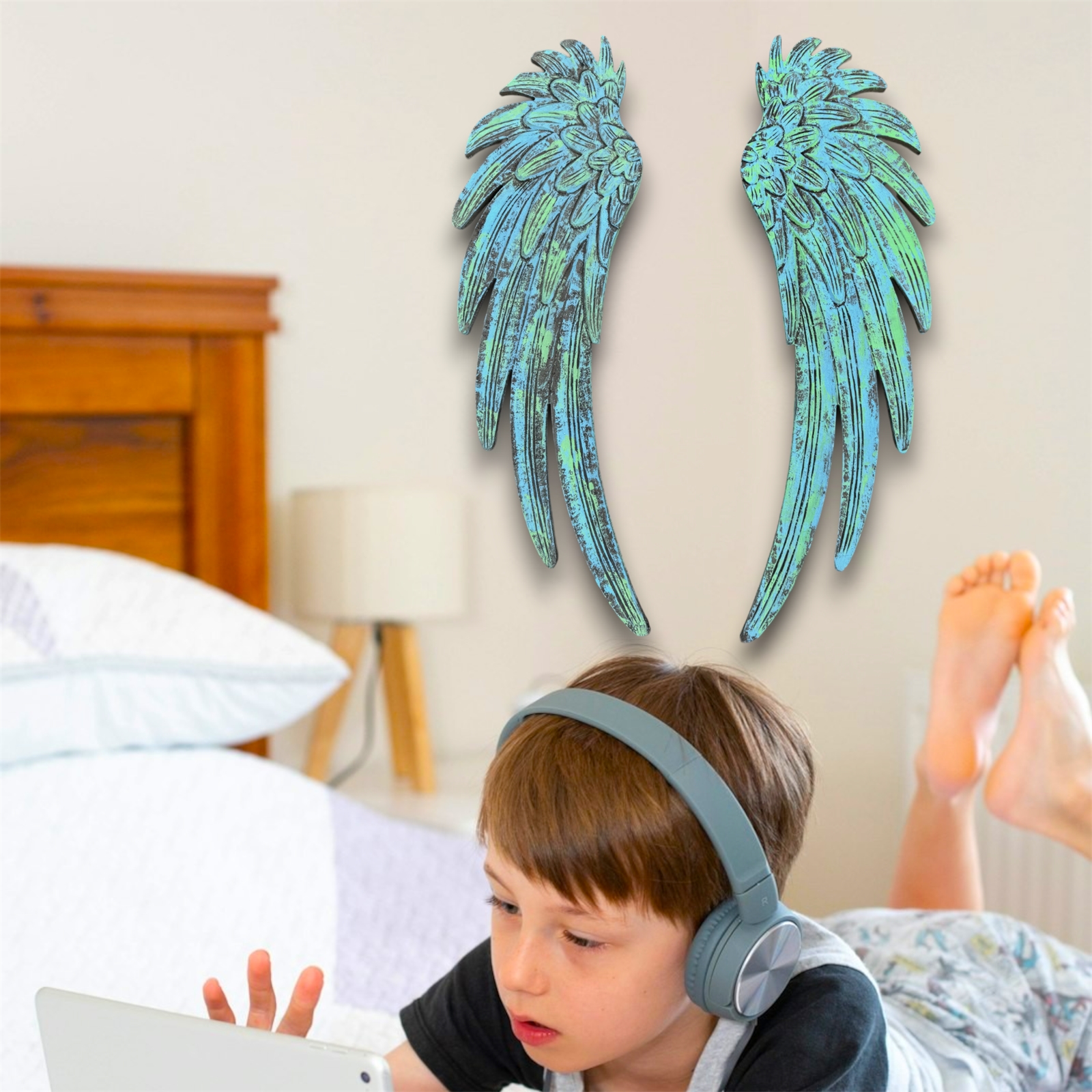 Measuring 11 wide x 35.75 high PER WING and with a thickness of 3/8, these versatile wings can be hung vertically for a classic look or arranged in a V-shape to symbolize victory and inspiration. Whether adorning a nursery, child’s bedroom, or a serene corner of your home decor, their uplifting design will radiate peace and grace.