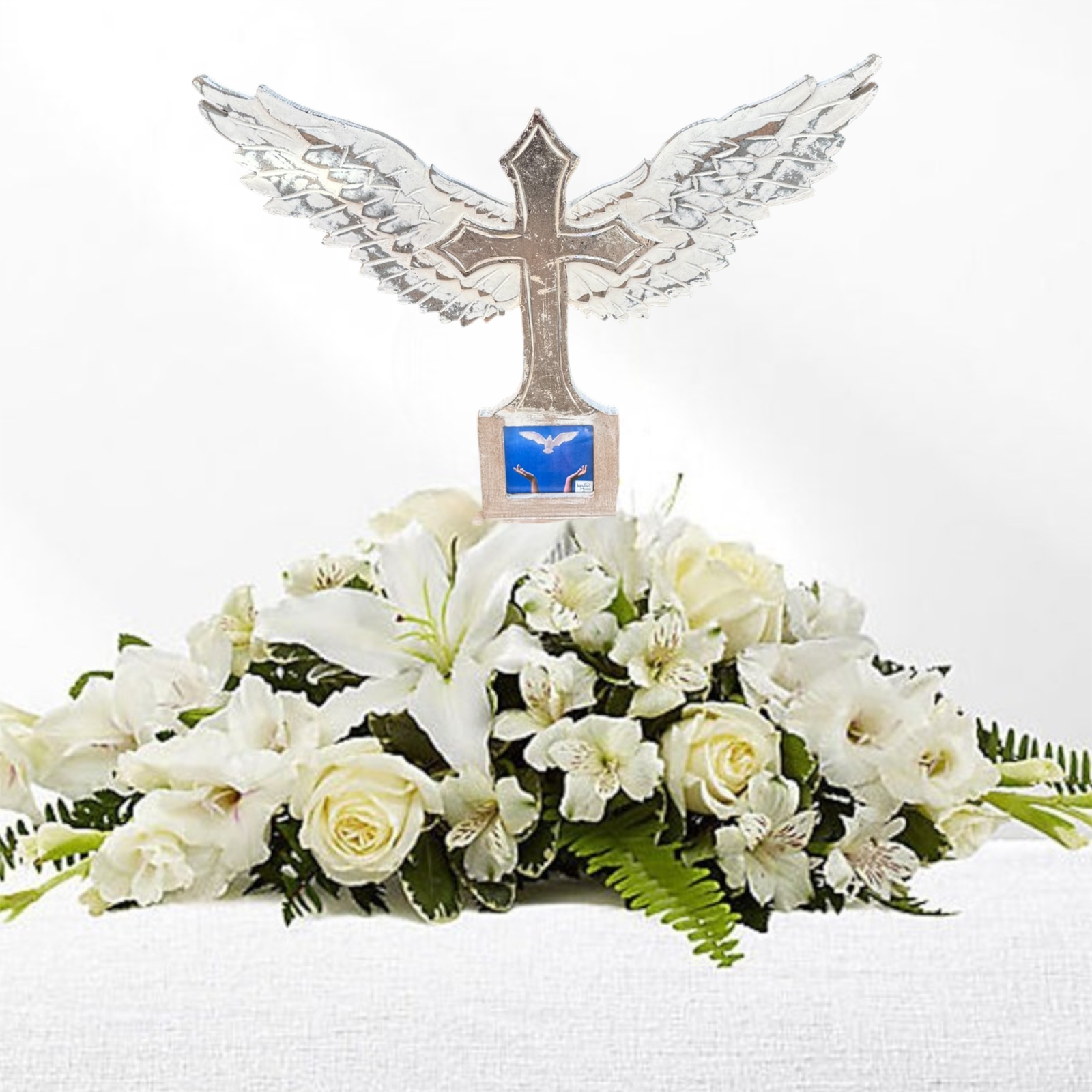 The cross is elegantly finished in a distressed white, enhanced by delicate silver foil adornments that add a touch of grace and sophistication. Resting on a sturdy pedestal base, this memorial piece measures 22 wide x 19.75 tall x 4 deep, making it a striking yet serene addition to any space.