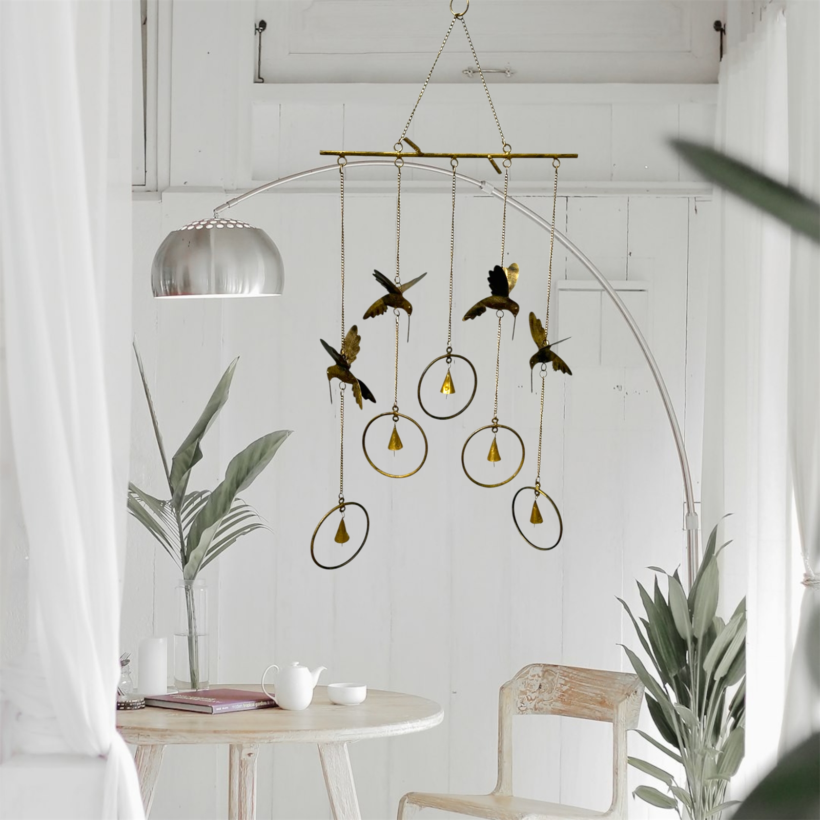 Add a touch of elegance and tranquility to your space with our Charm of Hummingbirds Hanging Metal Wind Chime. This beautifully handcrafted piece features 4 intricately stamped metal hummingbirds with an antique brass finish, gracefully suspended across 5 lines from a sleek straight rod hanger.
