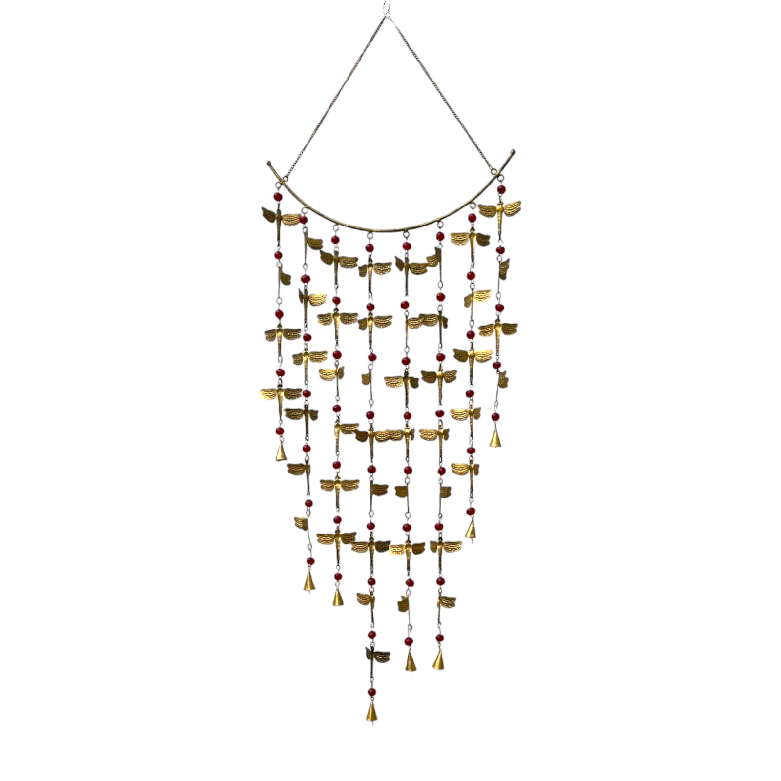 Transform your space with the enchanting beauty of our Swarm of Dragonflies Hanging Metal Wind Chime. This stunning piece features 47 intricately stamped metal dragonflies, each finished in a warm antique brass. Suspended in a cascading series of 8 lines from a gracefully bowed rod hanger, this wind chime is both a visual and auditory delight.