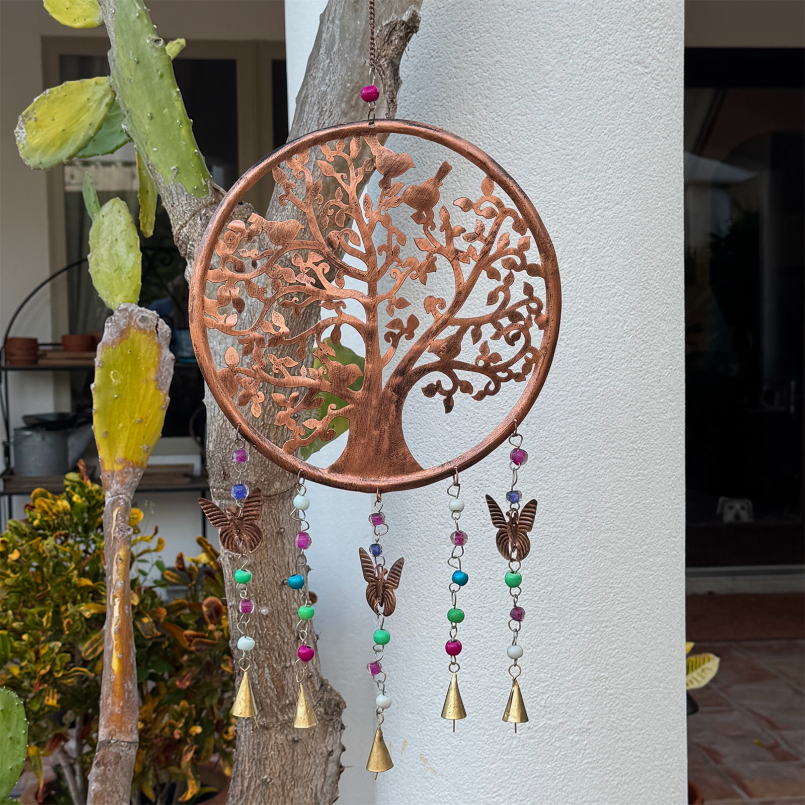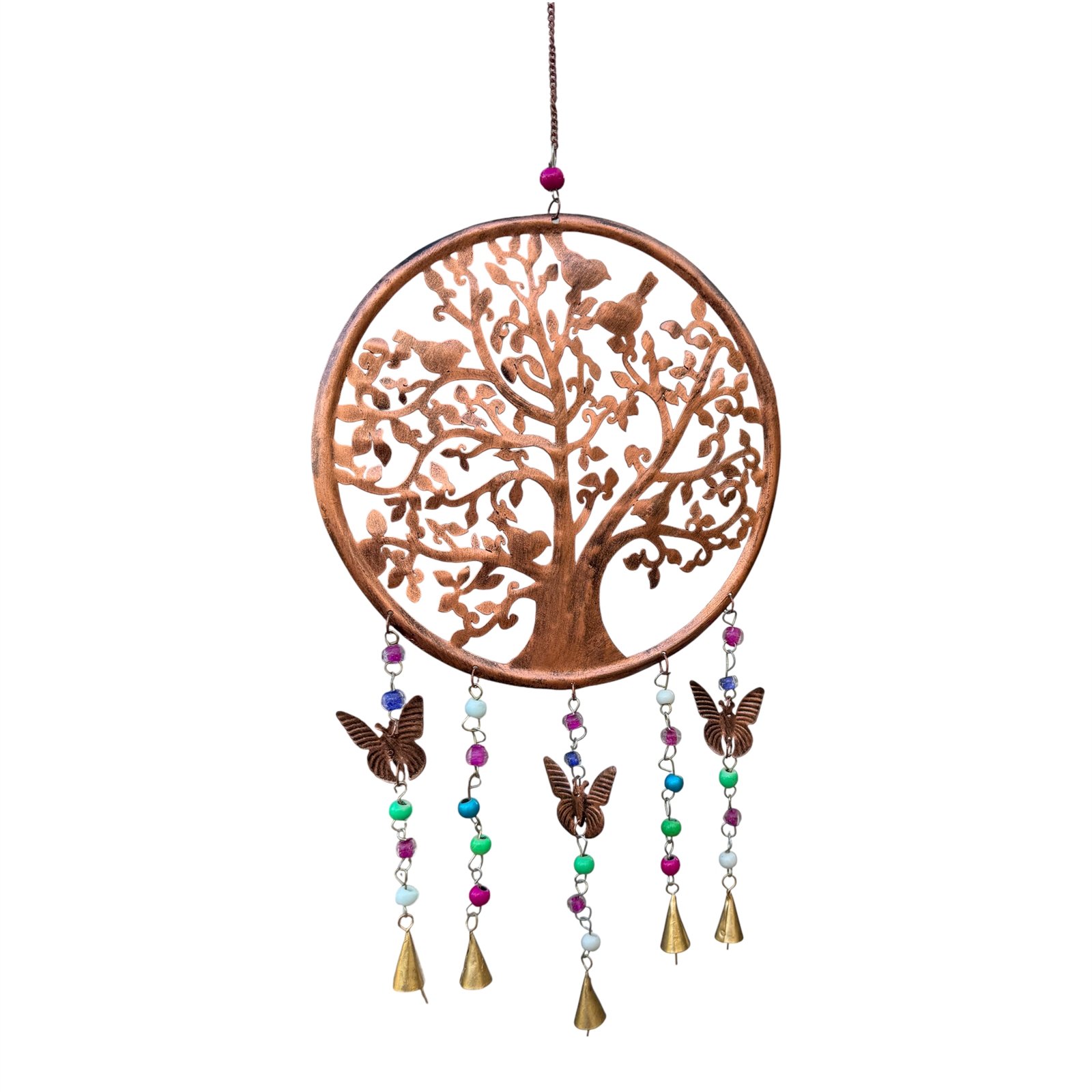 Five dangling strands cascade from the base of the tree, each adorned with multi-colored glass beads, floating metal butterflies, and finished with cone-shaped metal bells that create a soft, soothing sound in the breeze. The warm copper patina finish adds a rich, rustic glow, making this a standout accent for gardens, patios, porches, and indoor sanctuaries.