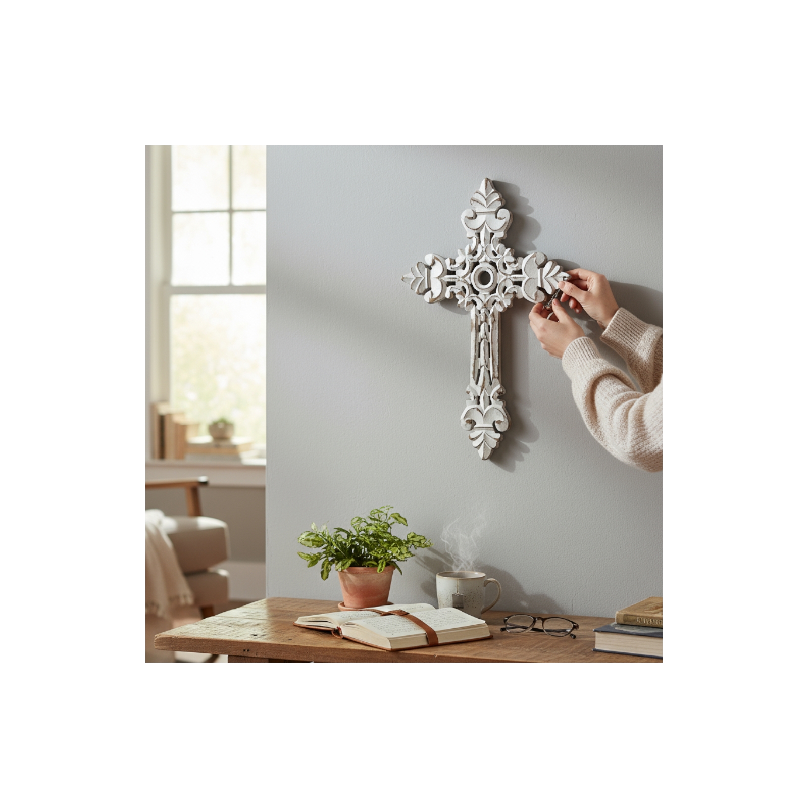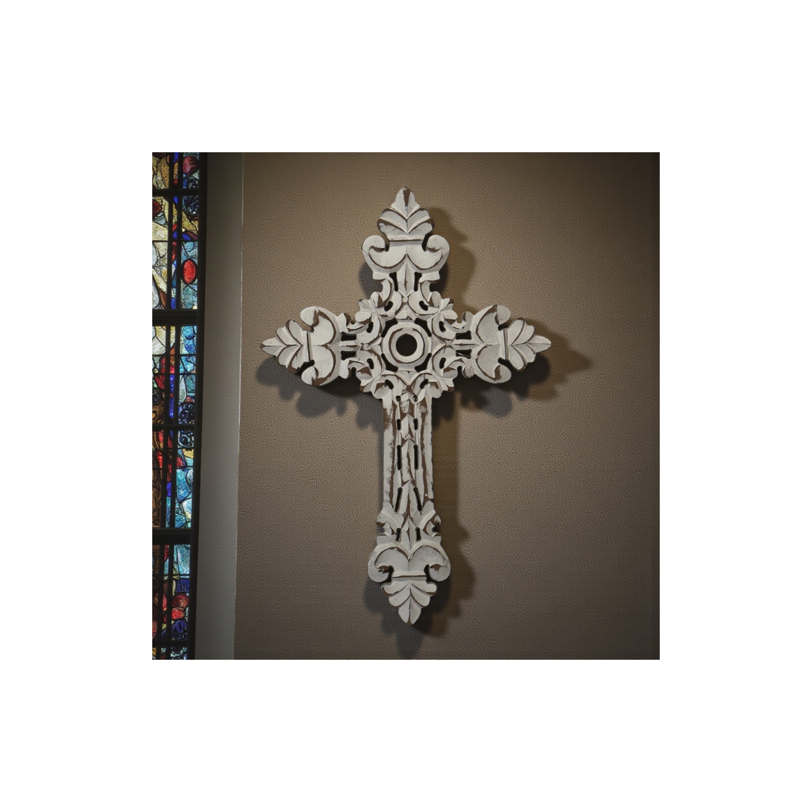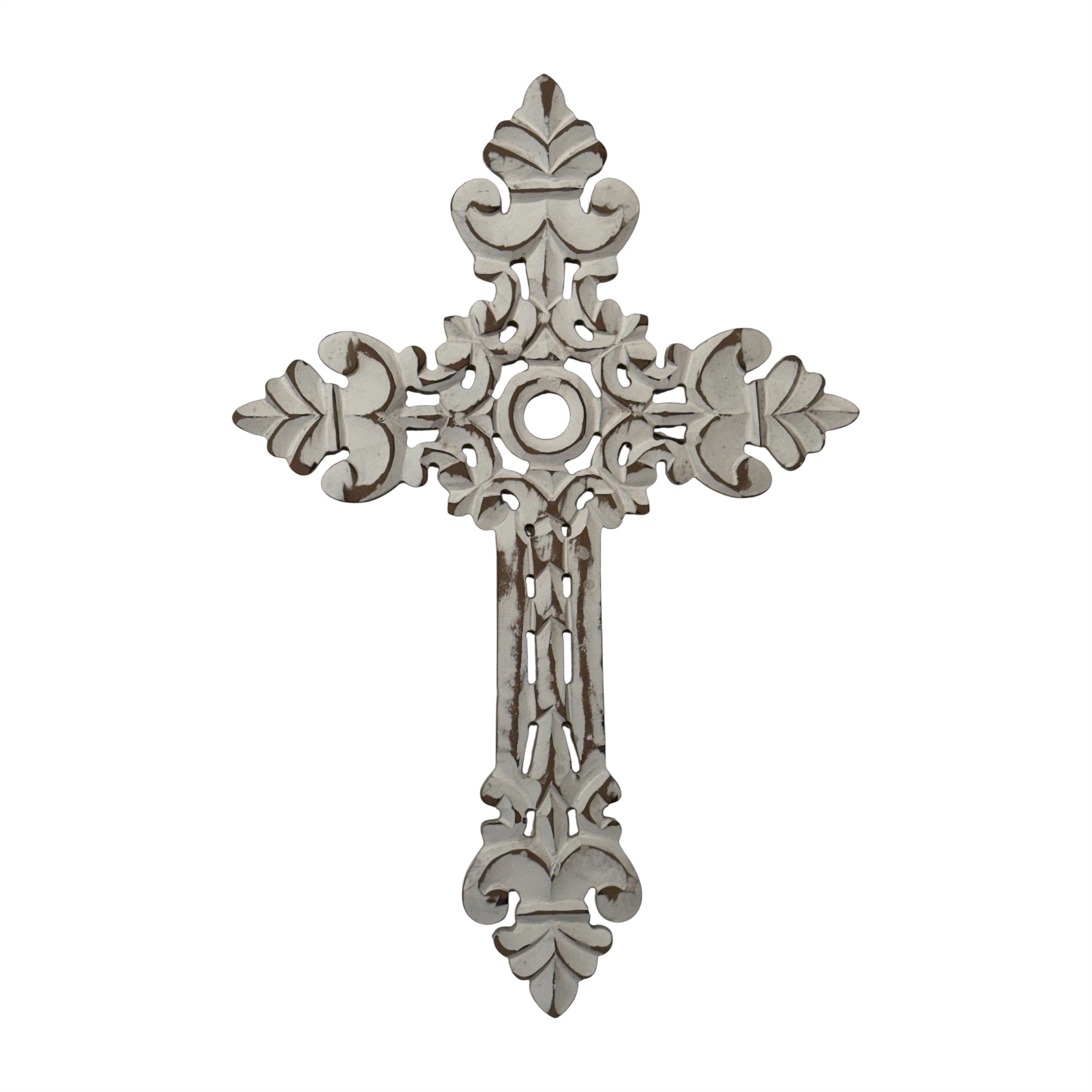 The San Raul Wall Cross is a beautifully detailed piece of spiritual décor, handmade in India from carved MDF. Each cross features fleur-de-lis tips and a unity circle carved at its center — a symbol of harmony and faith. The distressed white finish with caramel undertones adds warmth and vintage charm, making it a perfect accent for any home décor style.
