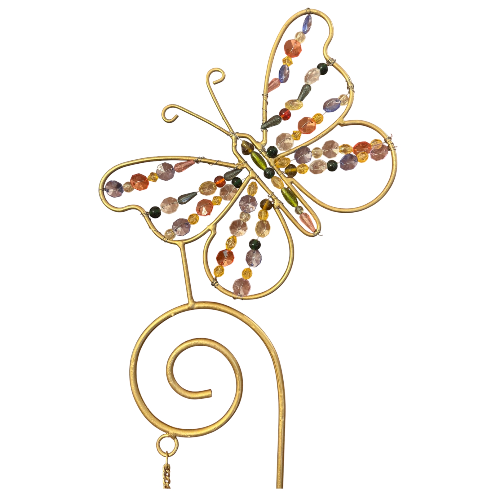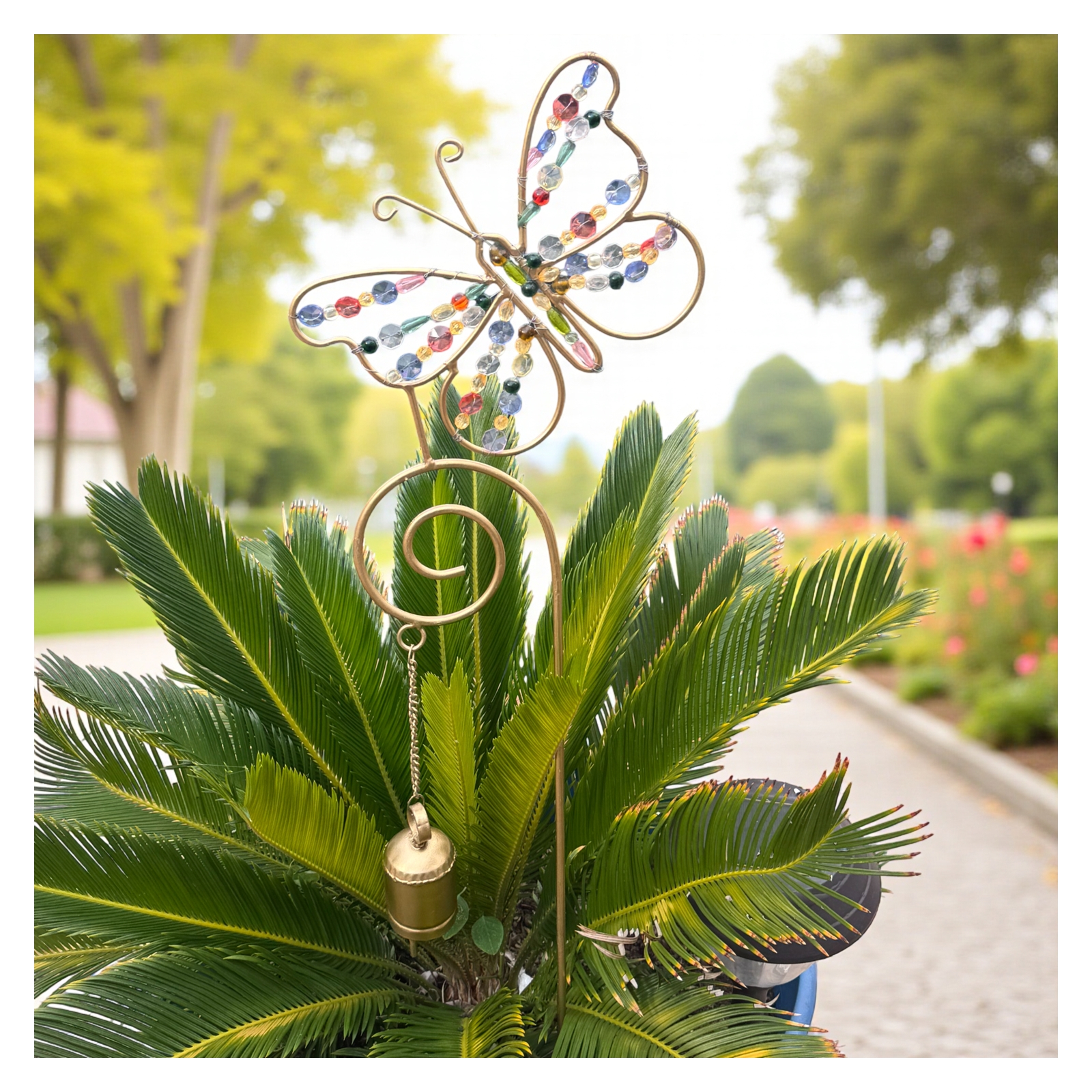 butterfly garden stake, jeweled garden decor, beaded butterfly stake, handmade garden decor, upcycled metal art, outdoor butterfly decoration, whimsical yard art, cowbell garden accent, handcrafted in India, sustainable garden decor, colorful outdoor decor, metal garden ornament, gold butterfly stake, fair trade garden art, boho garden accessory