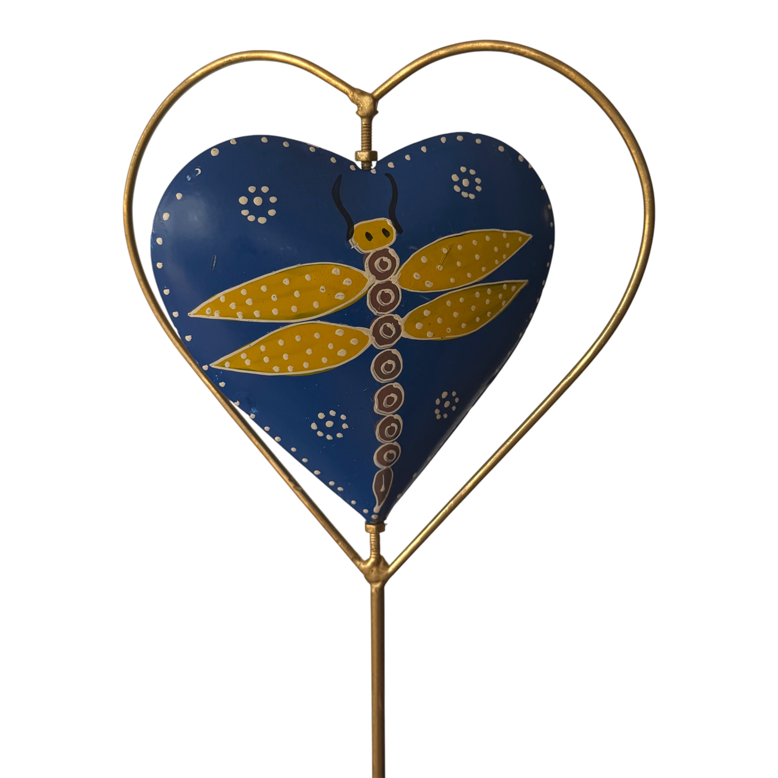 Bring vibrant color and joyful motion to any outdoor space with our Metal Twirling Heart Garden Stake. Each heart is beautifully hand-painted on both sides with intricate detail and set within a gold-painted metal frame that gently twirls in the breeze.