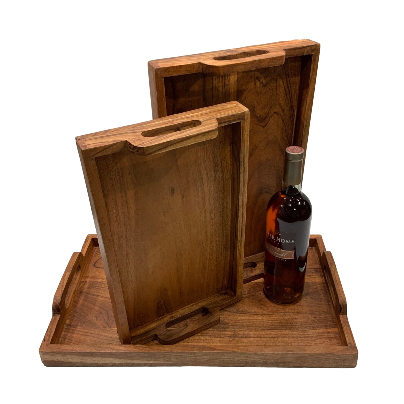 This set of three serving/charcuterie trays is the perfect addition to any home. Crafted from Acacia Wood these solid wood trays are food-safe sturdy and designed to last. The large tray measures 20 x 12 x 2 high while the other two trays nest inside for easy storage when not in use.