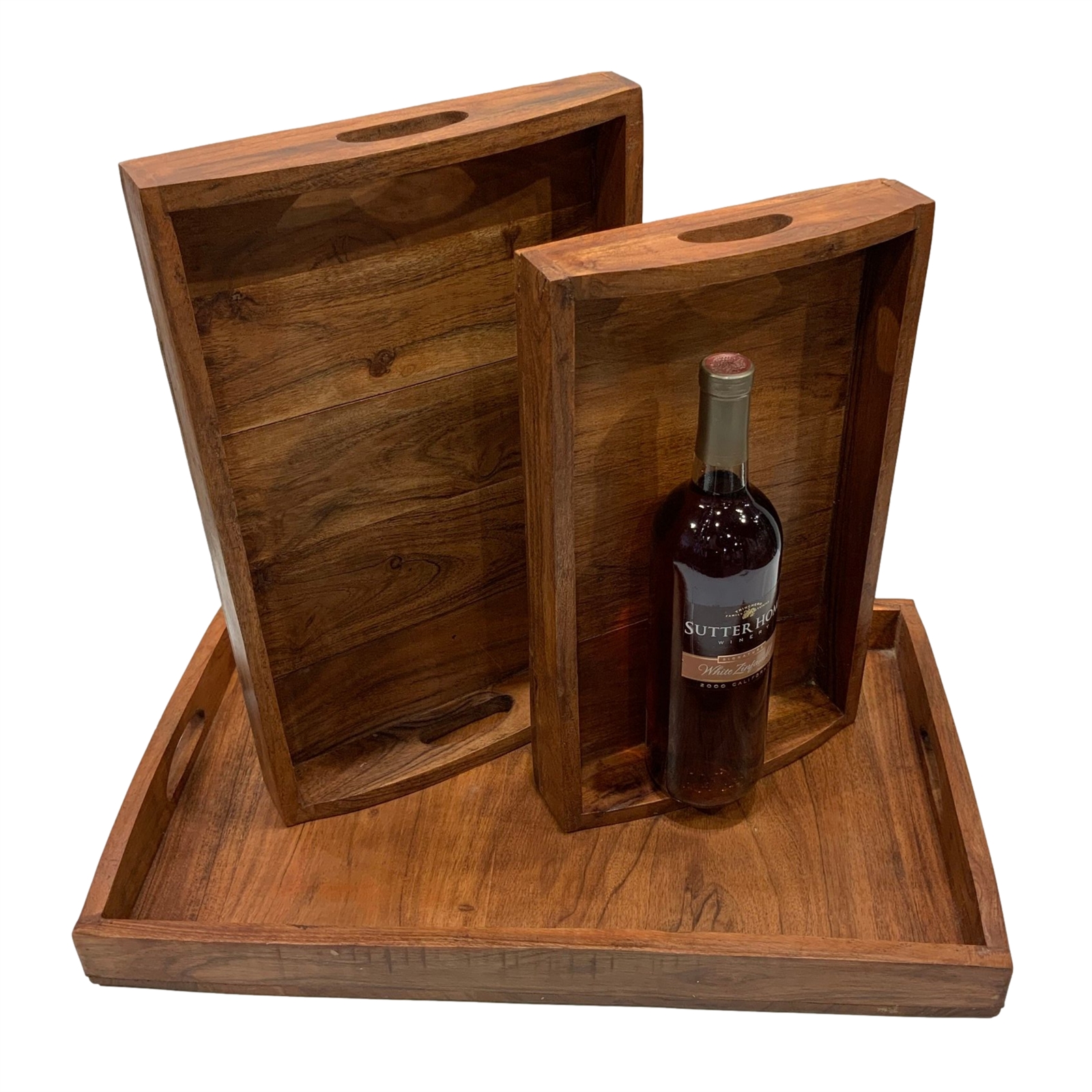 This set of three serving/charcuterie trays is the perfect addition to any home. Crafted from Acacia Wood these solid wood trays are food-safe sturdy and designed to last. The large tray measures 20 x 12 x 2 high while the other two trays nest inside for easy storage when not in use.