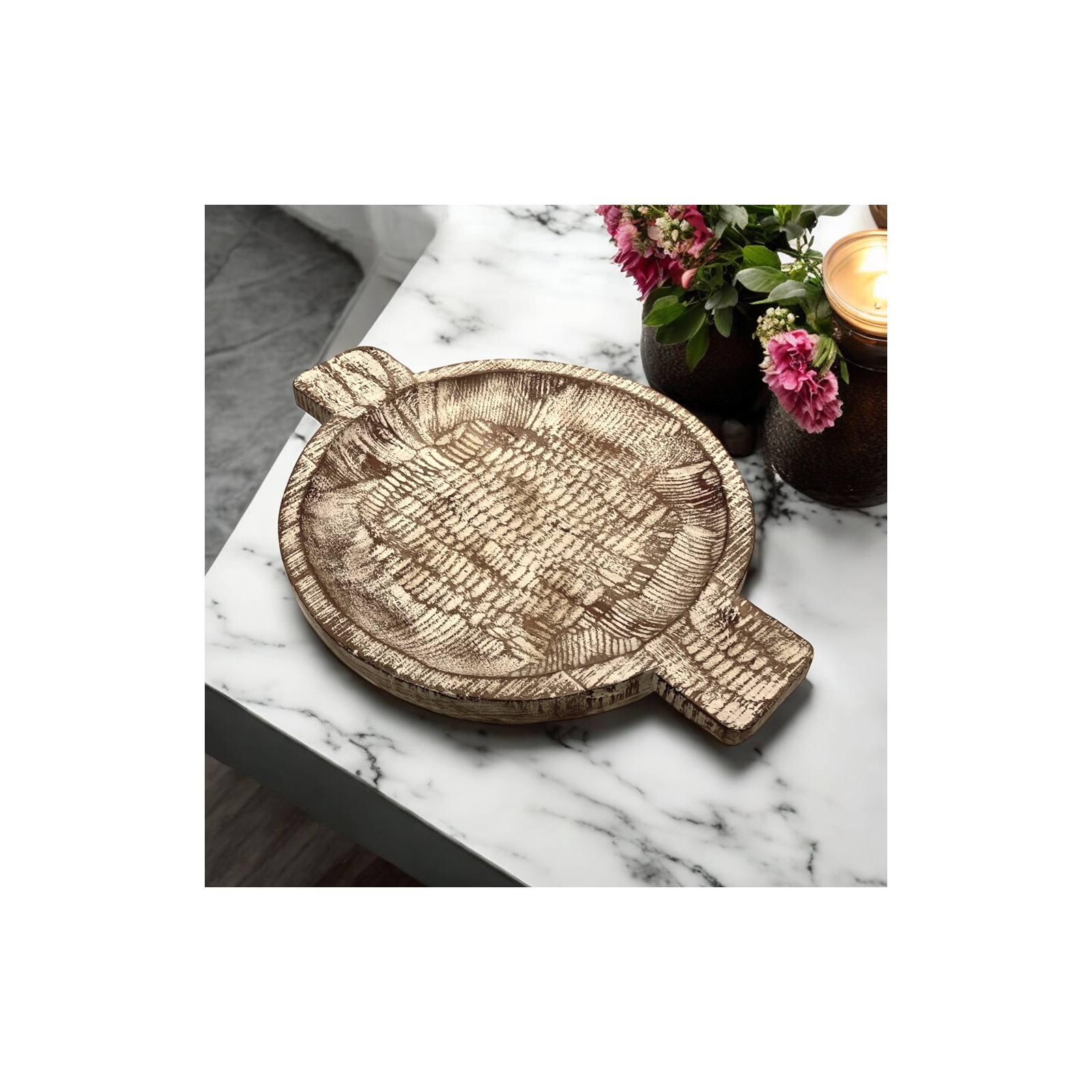 Hand-Carved Artisan Design: Hand-carved by skilled artisans in India, featuring a unique panning pattern that adds texture and visual interest.