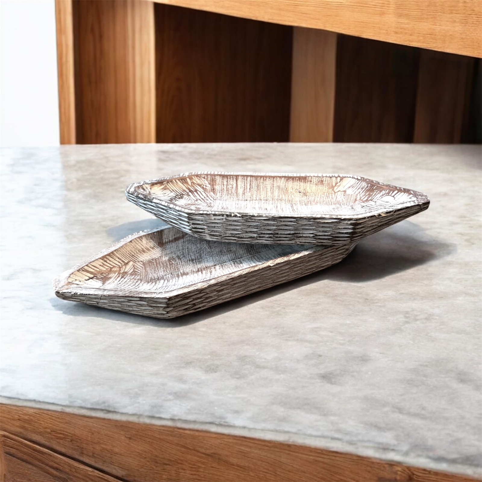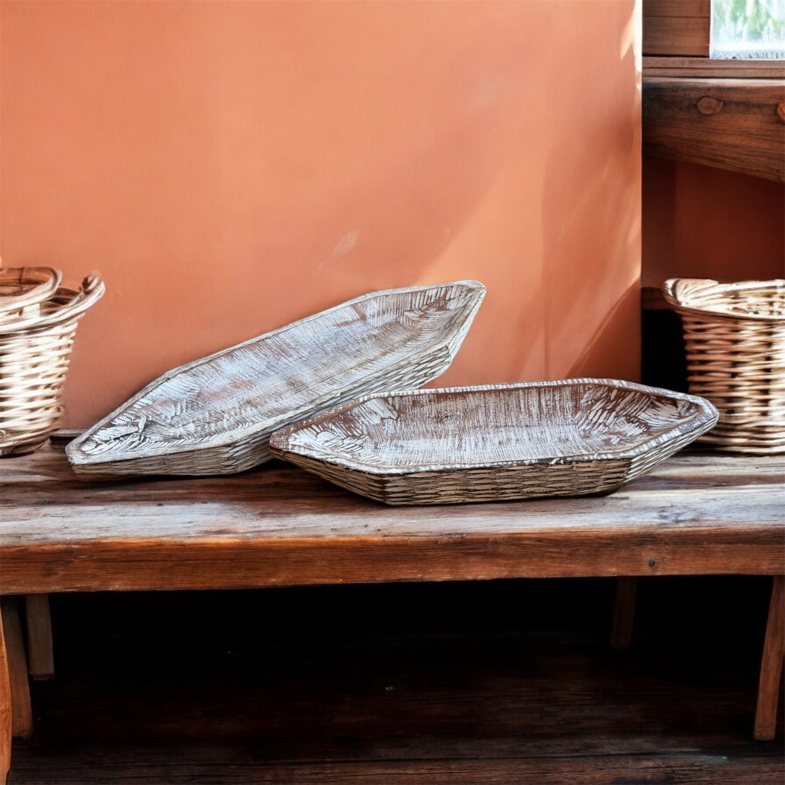 Rustic Whitewashed Finish: These canoe-shaped bowls feature a beautiful whitewashed finish over the natural eucalyptus wood, giving them a rustic yet elegant look that complements any decor.