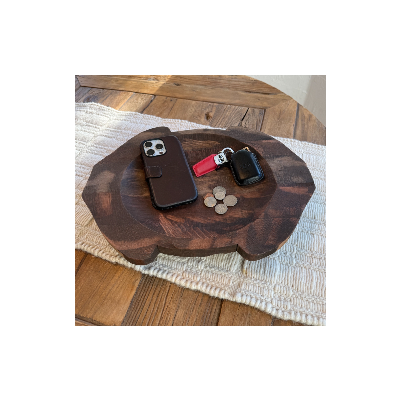 Elevate your organization game with our exquisitely handcrafted valet tray, made from high-quality eucalyptus wood and finished in a sophisticated burnt toast color. This versatile desktop storage organizer is perfect for any room, whether you’re looking to tidy up your nightstand, dresser, or entryway. The natural wood grain and artisanal craftsmanship make each tray a one-of-a-kind piece that adds warmth and elegance to your home decor.