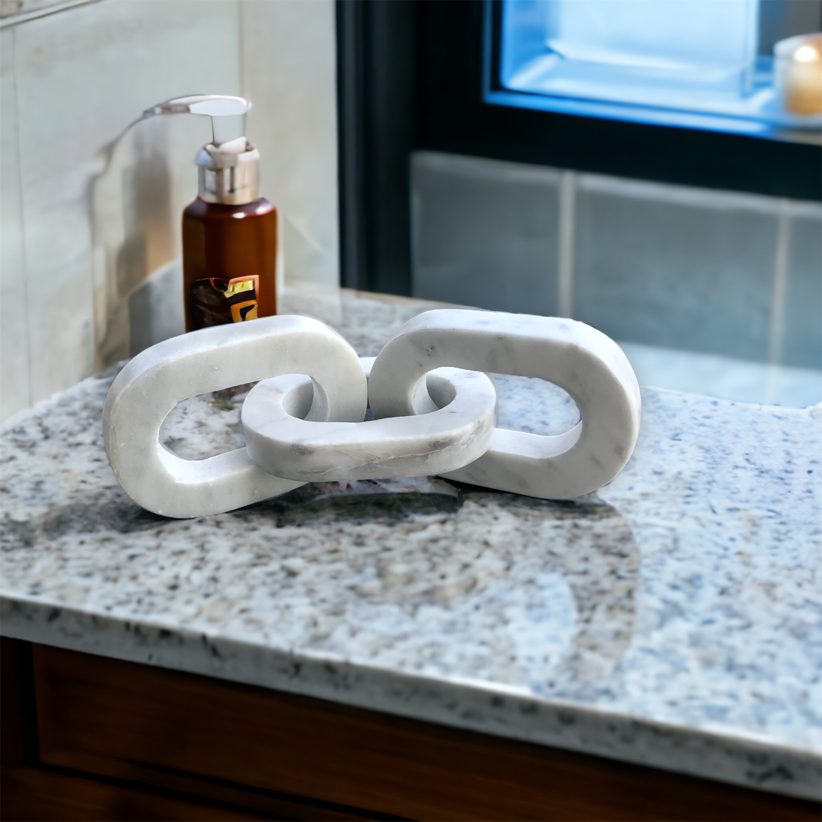 Hand-Tooled White Marble 3 Link Oval Sq-Cornered Chain the latest décor trend for the chic home. Sourced from India and skillfully crafted by hand each marble link is polished to a stunning luxurious finish.