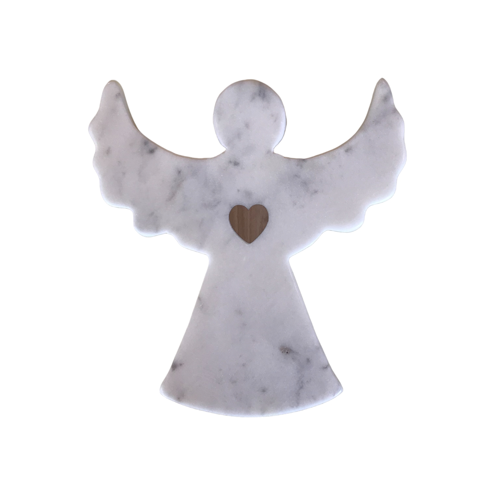 The White Marble Angel of Love Wall décor and Paper Weight is a stunning piece of art that exudes elegance and simplicity. Its design features an angel with spread wings and a mango wood heart inlay at its center. The piece is versatile and can be used as a wall décor or a paperweight as it has a hole drilled into the back for easy hanging or laying flat on a desk. Measuring 8 wide x .5 thick x 8.5 high the design has clean simple lines with rounded edges that give it a timeless appeal. Each Angel is packaged in a custom Thermocol carton for safe transportation during e-commerce.